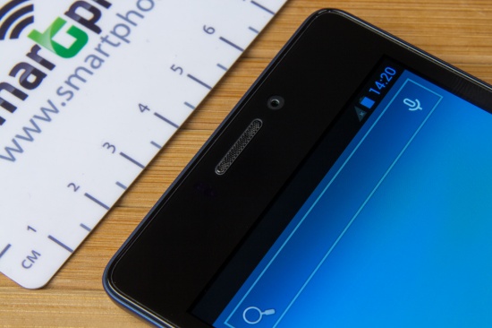 Передняя панель смартфона разделена между большим дисплеем, тремя классическими сенсорными кнопками, прорезью разговорного динамика, глазком фронтальной 5 Мп камеры и датчиками освещенности/приближения.