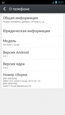 Работает Fly IQ 4412 под управлением операционной системы Android 4.2.1 «из коробки». В виду того, что трубка только начала продаваться, об обновлении оси до более актуального релиза пока не говорится.