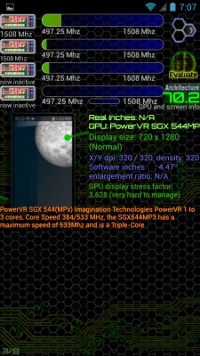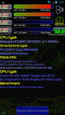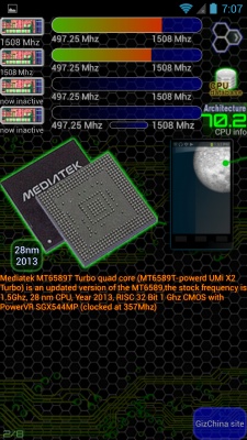 «Сердцем» системы является 4-ядерный MTK6589T, тактовая частота которого 1,5 ГГц. Кроме того, «на борту» 1 ГБ оперативной памяти и графический чип PowerVR SGX544MP.