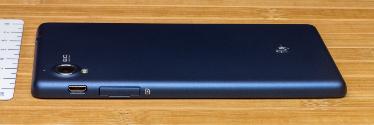 На правой боковой грани находится порт micro-USB, слот для карт micro-SIM. Кстати, отмечу - в Fly Coral поддержка dual-SIM не предусмотрена.