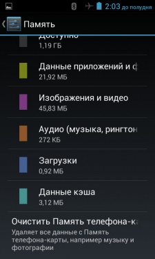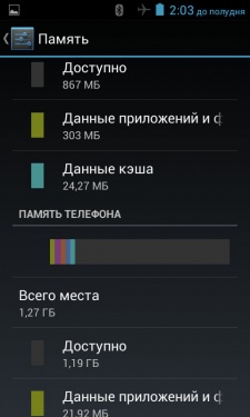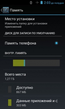 4 ГБ официально заявленной встроенной памяти. На практике, тем не менее, доступно чуть меньше: 1,27 ГБ — встроенная память телефона и ровно столько же на основе FLASH-носителя.