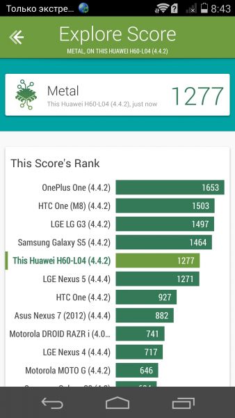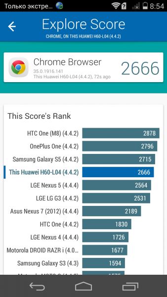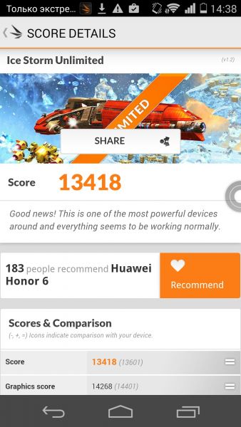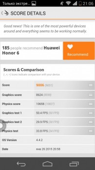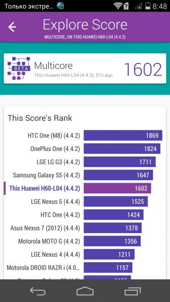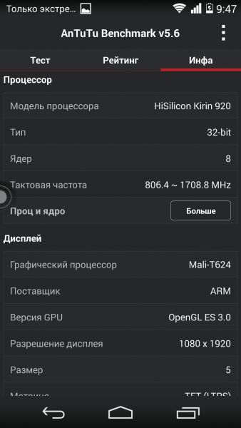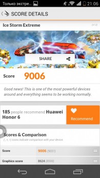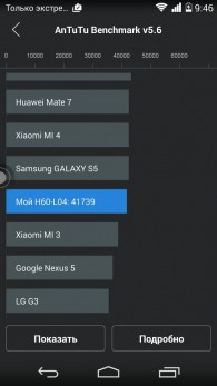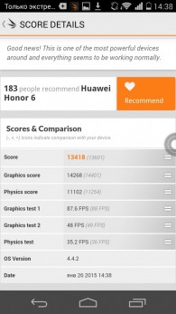 Дисплей5-дюймовый IPS-дисплей получил разрешение 1920х1080 точек. Плотность изображения составляет 445 пикселей на дюйм – отличный показатель, пикселизация абсолютно незаметна. Экран имеет хорошую цветопередачу и высокий запас яркости. Последняя, к слову, регулируется здесь как вручную, так и автоматически. В такой же способ можно настроить и цветовую температуру дисплея. Панель благодаря эффективному антибликовому фильтру не тускнеет на ярком солнце и может похвастаться отличными углами обзора без значительного сдвига цветов даже при больших отклонениях. От царапин и ударов экран гаджета защищает стекло Gorilla Glass третьего поколения. На внешнюю его часть нанесено качественнее олеофобное покрытие - палец отлично скользит по стеклу, а сама поверхность практически не собирает отпечатков пальцев. Сенсор чувствительный и одновременно распознает до десяти касаний и, кроме того, реагирует на прикосновения в перчатках. ПамятьПроизводитель предлагает Honor 6 в модификации с 16 ГБ встроенной памяти. Из них, отмечу, пользователю доступно 11,5 ГБ. Правда, при необходимости он может ее расширить с помощью карт памяти формата microSD максимальным объемом до 64 ГБ или же, подключив внешний USB-носитель, используя стандарт USB-OTG. Оснащение и производительностьHonor 6, как и подобает флагманам, — настоящий монстр современности по части «железа». Он использует фирменную платформу HiSilicon Kirin 920 — пожалуй, одна из самых мощных SoC на сегодняшний день. В ее состав входят 4 вычислительных ядра Cortex A7 с частотой 1,3-1,6 ГГц и 4 ядра Cortex A15 с частотой 1,7-2 ГГц, а также графический процессор Mali-T624. Объем оперативной памяти в аппарате внушителен — 3 ГБ. Характеристики начинки Honor 6 не только в цифрах выглядят впечатляюще, на практике смартфон умеет воспроизводить 4K-видео, без проблем справляется с самыми требовательными 3D-играми. Приложения и файлы запускаться быстро, без задержек осуществляются переходы по меню. Максимально производительная аппаратная начинка позволила Honor 6 войти в Топ-10 бенчмарка AnTuTu. А то, как себя проявил герой обзора в других тестерах, можете посмотреть на скриншотах ниже. Беспроводные модули и интерфейсыСмартфон получил модуль Wi-Fi 802.11a/b/g/n/ac с поддержкой технологий Wi-Fi Direct и Wi-Fi Display, а также Bluetooth 4.0 A2DP. Аппарат имеет встроенное FM-радио и умеет определять координаты по GPS с A-GPS, ГЛОНАСС. Возможности работать с NFC новинку лишили, зато добавили ИК-порт для управления бытовой техникой. Для быстрого доступа к активации беспроводных модулей связи их ярлыки вынесены в зону уведомлений. По части работы интерфейсов за время тестирования нареканий на качество у меня не возникло. Устройство поддерживает работу в 2G, 3G и 4G сетях. Слот для SIM-карты формата «микро» в сертифицированной для Украины модели один, в то время как на рынках других стран доступна и двухсимочная его версия. АккумуляторСмартфон оснащен батареей емкостью 3100 мАч. Полностью заряженного аккумулятора хватает при среднем уровне подсветки экрана на 9 часов просмотра Full HD видео, порядка 17 часов чтения или 4,5 часа игры в Asphalt 8. То есть, как минимум полтора-два дня работы без подзарядки гарантировано.