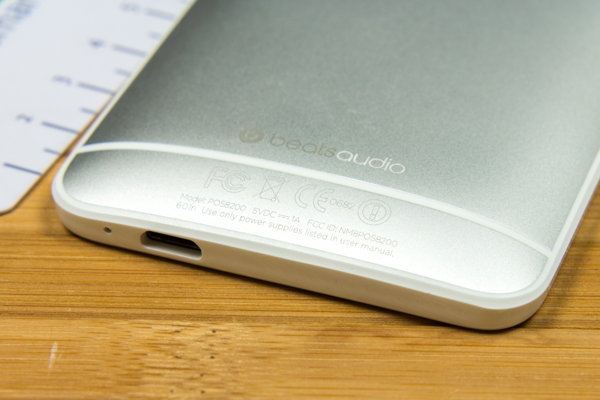 На тыльной части корпуса расположен микрофон шумоподавления, вспышка, основная камера и рекламные надписи, включая Beats Audio.