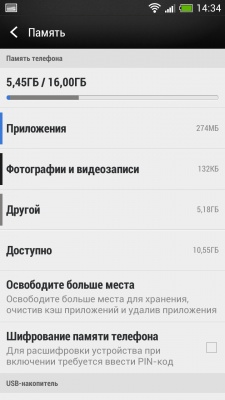 Общий объем пользовательской памяти 16 ГБ. Слота под карты памяти не предусмотрено. Для контента после полного сброса настроек доступно только 10,55 ГБ. На мой взгляд, это совсем немного. Выходит, что операционная система и оболочка занимают немалую часть дискового пространства. Спасает в этом случае только возможность подключения внешней USB флешки через USB-OTG кабель.