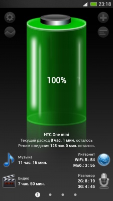 Емкости встроенного литий-полимерного аккумулятора на 1800 мАч с натяжкой хватает на один полный день, хотя, справедливости ради, отмечу, что в моих руках тестовый One mini использовался по полной. Суммарно это около часа разговоров, час-полтора прослушивания музыки, периодическое общение в сети и постоянная проверка почты. Иногда к этому добавлялись игры и просмотр видео, но не более часа. Словом, так или иначе, но в этом «малыше» хотелось бы видеть аккумулятор мощнее.