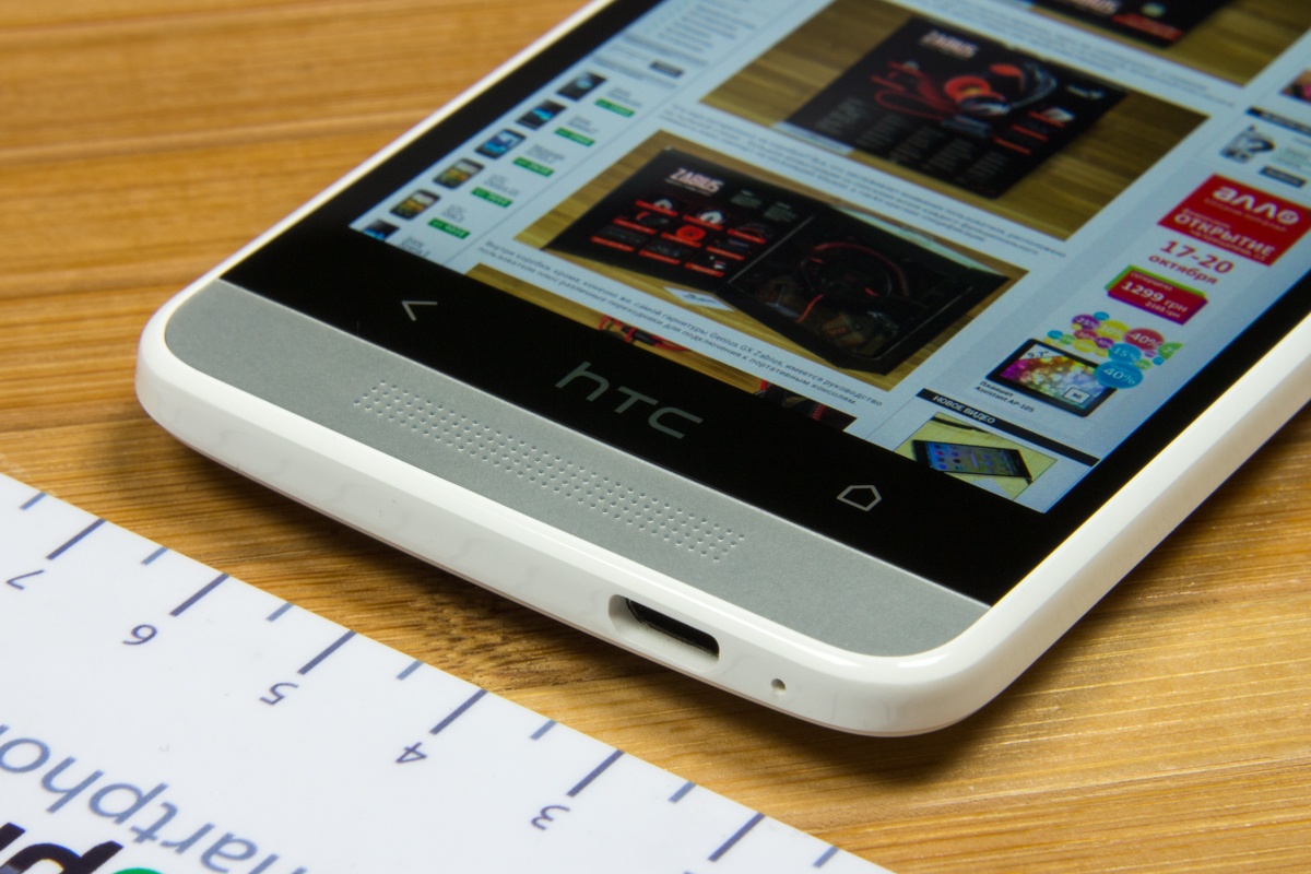 На нижнем торце только порт micro-USB, а на верхнем классический разъем 3,5 мм  и кнопка питания. На мой взгляд, такая эргономика является наиболее оптимальной для аппаратов подобных HTC One mini.