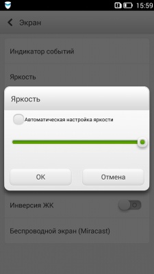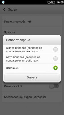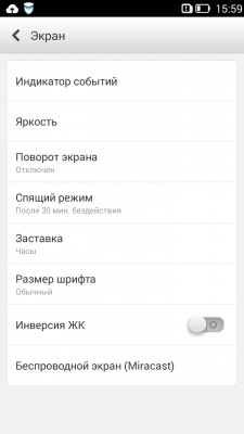Пребывая в соответствующем подменю настроек, пользователь может работать с индикатором событий, регулировать яркость, активировать либо отключить функцию «Поворот экрана», а также задействовать такую опцию как «Инверсия ЖК». Последняя делает фон темным, а отображаемые на нем буквы белыми – вполне удобное для глаз решение в ночное время суток.
