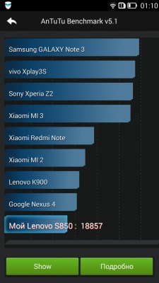 Lenovo S850 обладает 5-дюймовым дисплеем с разрешением 720х1280 точек. В основе IPS-матрица с достойными углами обзора как по вертикали, так и по горизонтали.