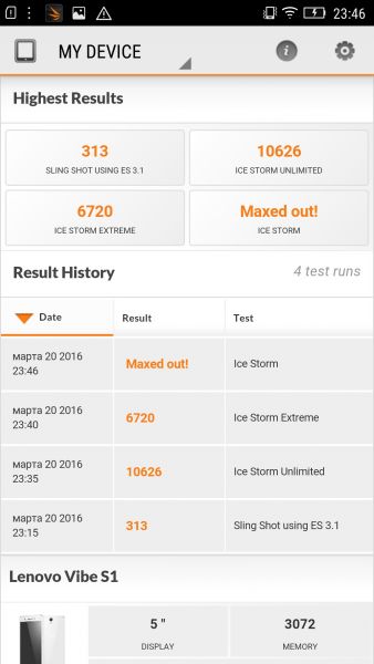 Обзор смартфона Lenovo Vibe S1 – селфи сразу в два объектива!Смартфон среднего ценового сегмента в корпусе из стекла и металла. Это уже само по себе любопытно. А если к этому добавить еще производительное «железо», 5-дюймовым Full HD экран и двойную фронтальную камеру, то получаем селфифон, мимо которого просто нельзя пройти мимо. Цена вопроса - $340. Насколько удачным получился аппарат для такого ценника и что еще сможет предложить!? Обо всем этом далее. Лень читать текстовый обзор? Смотрите видео-обзор...Дизайн и функциональные элементыВнешне Vibe S1 довольно сильно выделяется на фоне многочисленных конкурентов в категории смартфонов стоимостью до $340 – дизайнеры компании, нужно заметить, отлично потрудились. Во-первых, смартфон получился довольно тонким и легким - 70.8x7.8x143.3 мм при весе 132 г, соответственно удобным в управлении и ношении. Во-вторых, благодаря сглаженным углам и покатой тыльной панели он отлично лежит в ладони и не норовит из нее выскользнуть. Внешний лоск модели придает стекло Gorilla Glass 3, которым защищены его передняя и тыльная панели. Последний, правда, также быстро теряется из-за отпечатков пальцев, так хорошо собираемых стеклянной поверхностью. Впрочем, отчетливо заметны они на корпусе Vibe S1 в глубоком синем цвете, в котором он достался нам на тест, а вот белая и золотистая версии смартфона наверняка менее восприимчивы к ним. Дополнительной прочности монолитному корпусу гаджета придает металлическая рамка с шероховатой фактурой и скошенными в стиле iPhone 5 гранями. На правой и левой «боковушках», где обустроены кнопка питания, качелька регулировки громкости и гибридный слот, ее толщина составляет всего порядка 5 мм, а у верхнего и нижнего торца она расширяется почти до 8 мм. Сверху в окрашенный в цвет корпуса ободок встроен 3.5 мм аудиовыход и микрофон шумоподавления, а снизу порт microUSB и две решетки. Передняя панель устройства помимо 5-дюймового экрана и двух объективов фронтальной камеры примечательна наличием аккуратной решетки разговорного динамика, датчиками освещения и приближения, а также сенсорных кнопок управления без подсветки. На тыльной панели в свою очередь расположены объектив 13Мп камеры, обрамленный металлическим кольцом, двухцветная вспышка и логотип линейки. Замечу, что все элементы хорошо подогнаны, ничего не скрипит и не люфтит. Дисплей5-дюймовый экран Vibe S1с IPS-матрицей в основе оставил приятные впечатления – углы обзора широкие при отклонении от перпендикуляра к дисплею в любом направлении, нет проблем с контрастностью и цветопередачей, да и на ярком солнце он ведет себя очень достойно. Его разрешение составляет 1920х1080 точек, плотность пикселей на дюйм – 441, так что гладкость и четкость у экранной картинки на высоте. Порадовал дисплей Vibe S1 и обилием настроек. Так, помимо автоматической и ручной регулировки яркости его подсветки можно настроить цветовой баланс, активировать «Ночной режим» для комфортного использования смартфона в темное время суток, а также включить высокую чувствительность, которая позволит управлять смартфоном в перчатках. Сенсорный слой распознает до 10 одновременных касаний, причем на прикосновения реагирует четко, необходимость в повторном нажатии возникает крайне редко. Как уже упоминалось ранее, от царапин экран защищает стекло Gorilla Glass 3. На него нанесено качественное олеофобно