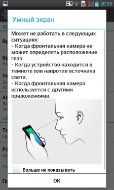 Суть ее в том, что подсветка дисплея будет работать ровно столько, сколько пользователь будет смотреть на экран. Как только он перестанет это делать, она не выключится еще столько времени, сколько назначено в соответствующем подменю. Да, быть может, для кого-то такое решение покажется мелочью, но для WEB-серфинга или чтения эта функция даже весьма необходимая.