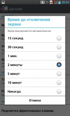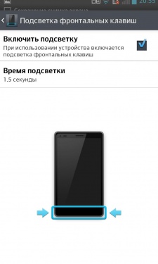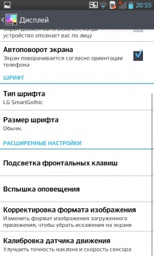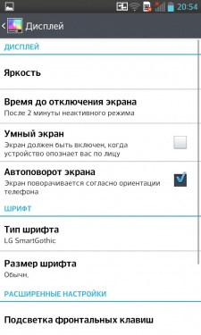Меню настроек весьма интересное. Отсюда пользователь узнает, что может регулировать подсветку дисплея автоматически и вручную, настроить тайм-аут подсветки для устройства, пребывающего в режиме бездействия, отключить либо же активировать режим акселерометра, настроить тип и размер шрифта, выставить тайм-аут подсвечивания фронтальных кнопок, произвести калибровку датчика движения, но что самое интересное - задействовать функцию «Умный экран»!
