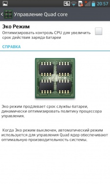 «На борту» LG Optimus G предусмотрена традиционная система энергосбережения. Активируется она автоматически, как только уровень заряда аккумулятора вашего смартфона достигает 30%. Что делает эта система!? Она отключает максимальное количество беспроводных модулей, уменьшает яркость подсветки до 20%, перенастраивает тайм-аут на 15 секунд и многое другое.