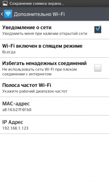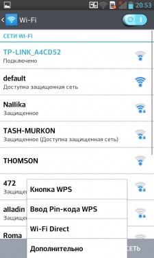 Модуль Wi-Fi поддерживает все стандарты, в том числе и скоростной N. В меню имеется кнопка WPS, пин-код для WPS, а также Wi-Fi Direct, подменю, отвечающее за уведомление пользователя, если его смартфон оказывает в зоне открытой точки доступа, и мн. др. Можно сделать так, чтобы этот модуль избегал «ненадежных соединений», а еще выбирать полосу частот.