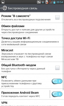Кроме того, пользователь может задействовать смартфон в качестве точки доступа Wi-Fi, работать с Wi-Fi Direct и функцией Miracast, посредством которой можно организовать беспроводную передачу видео или аудио со своего смартфона, например, на умный телевизор. Кроме того, в меню Optimus G есть и NFC, а также приложение Android Beam, VPN и пр.