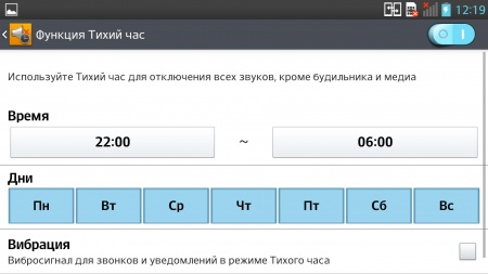 Интересной и полезной оказалась функция «тихий час», позволяющая отключать на заданный промежуток времени все звуки кроме будильника и медиа. Теперь не нужно волноваться за то, что кто-то потревожит ваш сон — LG Optimus G Pro будет его «охранять».