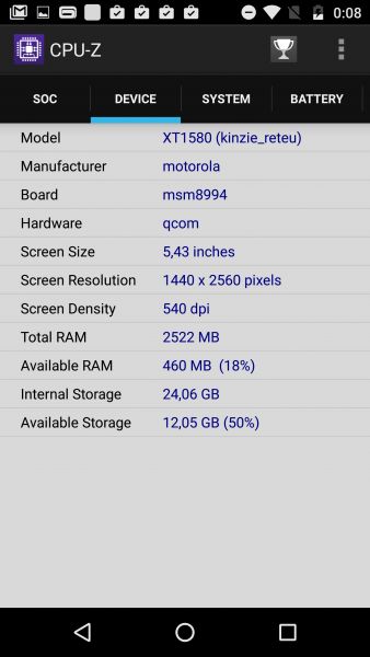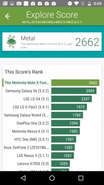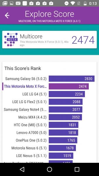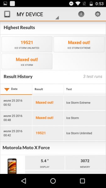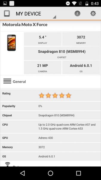 КомплектацияMoto X Force поставляется в большой коробке бело-оранжевых тонов. Список дополнительных аксессуаров следующий: скрепка для открытия лотка SIM-карт, инструкция и зарядное устройство. Последнее, кстати, поддерживает технологию ускоренной зарядки TurboPower, однако лишено USB-выхода. На этом фоне отсутствие USB-кабеля в комплекте поставки флагмана неприятно удивило. Дизайн и функциональные элементыВыглядит Moto X Force строго, как, впрочем, и подобает смартфонам, претендующим на звание защищенных. Правда, защищенным не в привычном нам понимании от воды и пыли, хотя нанопокрытие с водоотталкивающим свойством от проникновения внутрь корпуса дождевых капель и брызг у него все же есть, а от падений. Причем падений экраном вниз. Дисплей, который является самым уязвимый элементом любого смартфон, у Moto X Force защищен как ни у кого другого. Он выполнен по уникальной технологии ShatterShield и является, по словам производителя, небьющимся. Ну, по крайней мере, при падении с высоты человеческого роста. Состоит он с четырех слоев: алюминиевой подложки, гнущейся pOLED матрицы, двойного сенсорного слоя и двух защитных панелей. Небольшой краш-тест X Force мы провели и у себя в офисе, его результат вы можете посмотреть в видеообзоре смартфона. На передней панели помимо большого дисплея обустроены датчики освещения и приближения, объектив 5Мп камеры с LED-вспышкой, разговорный и мультимедийный динамики. Прорези под них довольно глубокие, поэтому очень активно забиваются пылью. На верхнем торце смартфона слева от 3.5 мм аудиовыхода расположен выдвижной слот для nanoSIM-карты и карты памяти. На нижнем обустроен лишь порт microUSB. Правая «боковушка» аппарата отдана под кнопку питания и качельку регулировки громкости. Они, как и рамка вокруг корпуса X Force, металлические, имеют хороший отклик, а включения/выключения еще и шероховатую текстуру, так что ее очень легко нащупать вслепую. Но для управления одной рукой, особенно небольшой женской, X Force явно непредназначен. Довольно большие габариты - 150х78х9.2 мм при весе 170 г, и отсутствие режима управления одной рукой при диагонали экрана в 5.4 дюйма сыграли злую шутку по части так называемой «юзабилити». Впрочем, для многих пользователей, у которых в приоритете большой экран для комфортного веб-серфинга, просмотра фильмов ну или же использование смартфона в качестве автомобильного навигатора, это уже давно не проблема. Тем более, X Force один из немногих флагманов, а может и единственный, который даже если и выскользнет из руки в процессе использования, останется цел и невредим. Да, на металлической рамке могут остаться вмятины. А вот чтобы повредит так называемый «баллистический нейлон», из которого изготовлена тыльная панель, нужно тщательно тереть смартфон об асфальт, что, конечно же, никто специально делать не будет. На ощупь, кстати, материал напоминает ткань и это первое обозреваемое нами мобильное устройство, в котором он используется. Впечатления приятные, так как, и выглядит привлекательно, и совершенно не скользкий для руки. Стильности дизайну тыльной панели Moto X Force добавляет также металлическая вставка, объединяющая объектив его 21Мп основной камеры, двухцветную вспышку и логотип бренда. ДисплейПомимо того, что дисплей смартфона очень прочный, он еще и качественный по части воспроизводимого им изображения. Используется AMOLED-ма