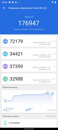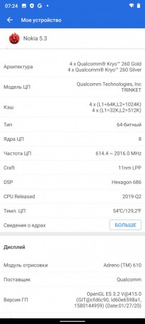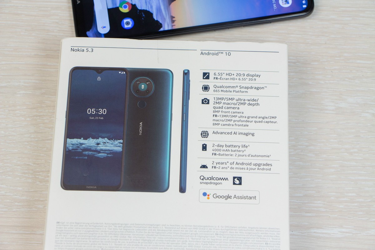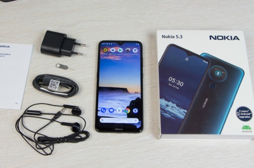 Обзор смартфона Nokia 5.3: фанаты оценятNokia 5.3 – смартфон с четырьмя камерами, Android 10 и Android One и процессором Snapdragon. Цена $190, за которую предлагается батарея всего на 4000 мАч, но в комплекте с большим дисплеем в 6,55 дюйма. Личные впечатления о смартфоне, возможности аппаратной составляющей и фото с камер покажу в обзоре. Дизайн и Корпус Nokia 5.3 – смартфон с дизайном, который стоит той суммы, которую за него просит производитель. Это я гарантирую. Тыльная панель не глянцевая, а это уже хорошо и практично. У меня на обзоре черный телефон, в продаже есть и другие, кстати, более интересные расцветки. Что касается габаритов и веса, то Nokia 5.3 понравилась. У телефона удобные формы, скругленные края, отличная сборка. Так что, если цените качество – присмотритесь к этому смартфону. Лицевая сторона стандартна. В каплевидном вырезе размещена фронтальная 8 Мпикс. камера, а под дисплеем нам напомнили, кто производитель тестируемого гаджета. Кнопку регулировки громкости и клавишу питания расположили на правом торце устройства, так же, как и у большинства других смартфонов, поэтому необходимости привыкать не будет. Индикатор событий красиво вписали в кнопку питания. Отдельной клавишей на левом торце вызывается Google Assistant. Эту кнопку под себя не настроить. Я иногда пользуюсь им, но так чтобы выделять под него отдельную клавишу, спорное решение. Сканер отпечатка пальцев выполняет свою работу качественно и быстро, хотя я не всегда попадал по нему с первого раза, уж очень низкий переход между ним и тыльной крышкой. Вес в 185 г как раз для руки и не ощущается в кармане. Габариты: 164.3 x 76.6 x 8.5 мм. Дисплей Дисплей большой – 6,55 дюйма, но разрешение не FullHD, а только HD+ - 720x1600 пикселей. В плюсы экрану сразу же записывает защитное стекло Gorilla Glass 3. В основе IPS матрица, настройки позволяют выбрать комфортный для глаз цветовой баланс. Запаса по яркости хватает чтобы комфортно читать в полной темноте, а вот максимального уровня мало для солнечного дня. Приходится всматривается, чтобы прочитать мелкий текст. Углы обзора идеальны. Соотношение сторон экрана 20:9, что идеально при просмотре видео. Так что, если это одна из главных задач. Которые вы ставите перед смартфоном, тогда Nokia 5.3, возможно, Ваш выбор. Аппаратная начинка Внутри смартфона процессор Snapdragon 655 (Qualcomm SM6125 11 нм, 8 ядер - 4x2.0 Ггц Kryo 260 Gold и 4x1.8 Ггц Kryo 260 Silver) и графический чип Adreno 610. Оперативной памяти 4 ГБ, встроенной 64 ГБ. В Antutu телефон набрал 176 тыс. баллов. Даже самые требовательные к графике и тяжелые игры, такие как PubG Mobile, работают плавно при средних настройках. Еще в прошлом 2019 году я бы записал этот смартфон в середнячки, но в 2020 только в верхнюю часть списка бюджетных устройств. Покупатель оценит, что производитель конструктивно предусмотрел три слота: два для nanoSIM и один для карт памяти microSD. За время двухнедельного теста смартфон ни разу не ошибся. Не было проблем со связью и беспроводными модулями. WI-Fi двухдиапазонный (Wi-Fi 802.11 b/g/n/ac), Bluetooth в версии 4.2. Через USB Type-C порт можно не только заряжать смартфон, но и подключать накопители через OTG. Работает Nokia 5.3 на Android 10, поддерживается программа Android One (обновления ОС и все улучшения по части безопасности приходят на смартфон сразу после их анонса разработчиками). 2 года обновлений Android и 3 года ежемесячных обновлений безопасности гарантированы. Лишних программ внутри нет. Аккумулятор Что кас