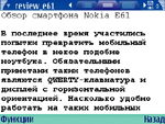 Обзор смартфона Nokia E61В последнее время среди производителей участились попытки превратить мобильный телефон в некое подобие ноутбука. Обязательными приметами таких телефонов являются QWERTY-клавиатура и дисплей с горизонтальной ориентацией. Насколько удобно работать на таких мобильных гибридах, мы попытаемся узнать на примере Nokia E61 – первого QWERTY-смартфона финского производителя. Смартфон Nokia E61 ориентирован на корпоративных пользователей, которые помимо телефонных звонков хотят иметь дело с текстовыми сообщениями и электронной корреспонденцией. Среди его конкурентов можно назвать такие зарекомендовавшие себя терминалы, как Motorola Q, Samsung SGH-i320 и Palm Treo 750v. Nokia E61 дебютировал еще в конце прошлого года вместе с двумя другими моделями – E60 и E70, однако обзор этой модели мы проводим, учитывая пожелания наших читателей и то, что спрос на нее все еще высок. Первое, на что обращаешь внимание, взяв в руки смартфон E61, это QWERTY-клавиатура с русской раскладкой, которая предназначена для набора большими пальцами рук. Сразу же бросается в глаза то, что некоторые буквы русского алфавита не поместились в традиционной раскладке. Поэтому разработчики обозначили этими буквами кнопки в нижней части клавиатуры. К новому расположению клавиш, обозначающих буквы, придется привыкать примерно неделю, после чего скорость набора текста существенно возрастет. Среди специфических кнопок в Nokia E61 есть две клавиши Shift (обозначенные черными стрелками, направленными вверх), кнопка ввода альтернативного символа (расположена в левом нижнем углу) и клавиша вызова таблицы символов. Несмотря на обилие кнопок, нам так и не удалось набрать на клавиатуре знак "№".
