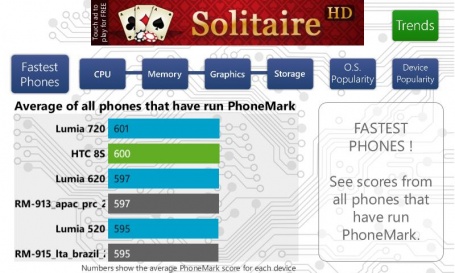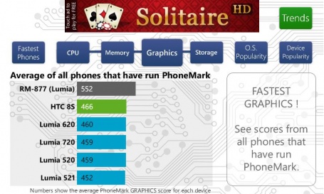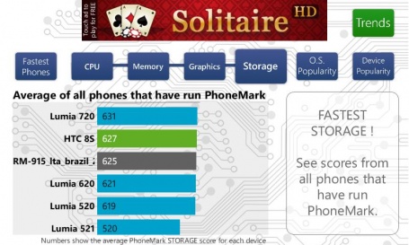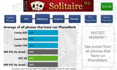 А вот и результаты производительности, показанные смартфоном в различных тестерах. Как видите, Lumia 520 достойно конкурирует по показанным результатам с старшими моделями Lumia 620 и 720.