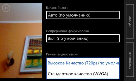 В настройках фото можно выбрать режим сьемки, настроить ISO, экспозицию, баланс белого и формат изображения. А в настройках видео доступен выбор режима видеосъёмки, баланса белого и включение/выключение непрерывной фокусировки.