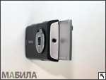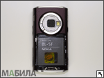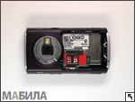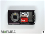 Блок основной камеры расположен на обратной стороне аппарата. Камера защищена двумя сходящимися шторками, которые приводятся в действие поворотным механизмом, и экипирована диодной вспышкой. Шторки не очень надежно защищают камеру от попадания пыли, скорее всего, их основное назначение — защита камеры от царапин и других повреждений. Модуль камеры несколько выдвинут из корпуса, из-за чего телефон не совсем ровно лежит на столе. Крышка аккумулятора снимается нажатием на кнопку фиксатора (внизу) и сдвиганием вниз. Под крышкой скрывается аккумулятор BL-5F емкостью 950 мАч. Если случайно вытащить аккумулятор при включенном смартфоне, на экране можно будет наблюдать остаточную картинку, которая будет гаснуть в течение минуты. Слот для SIM-карты находится под аккумулятором, поэтому для замены «симки» придется обязательно снимать батарею. К контактам SIM-карта прижимается специальным фиксатором-дверцей.