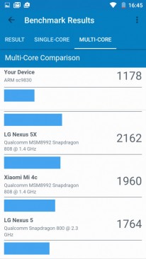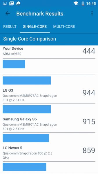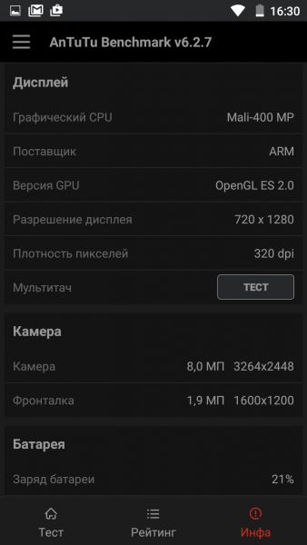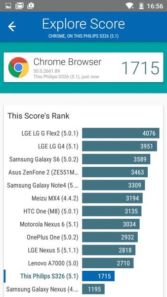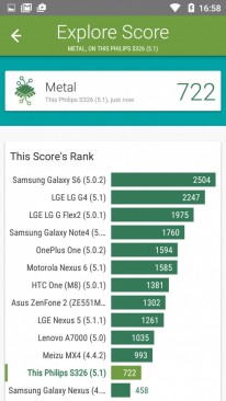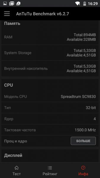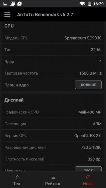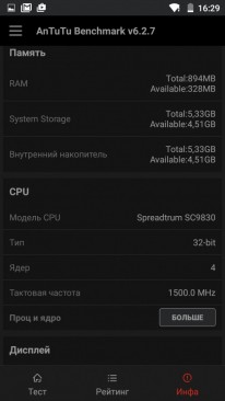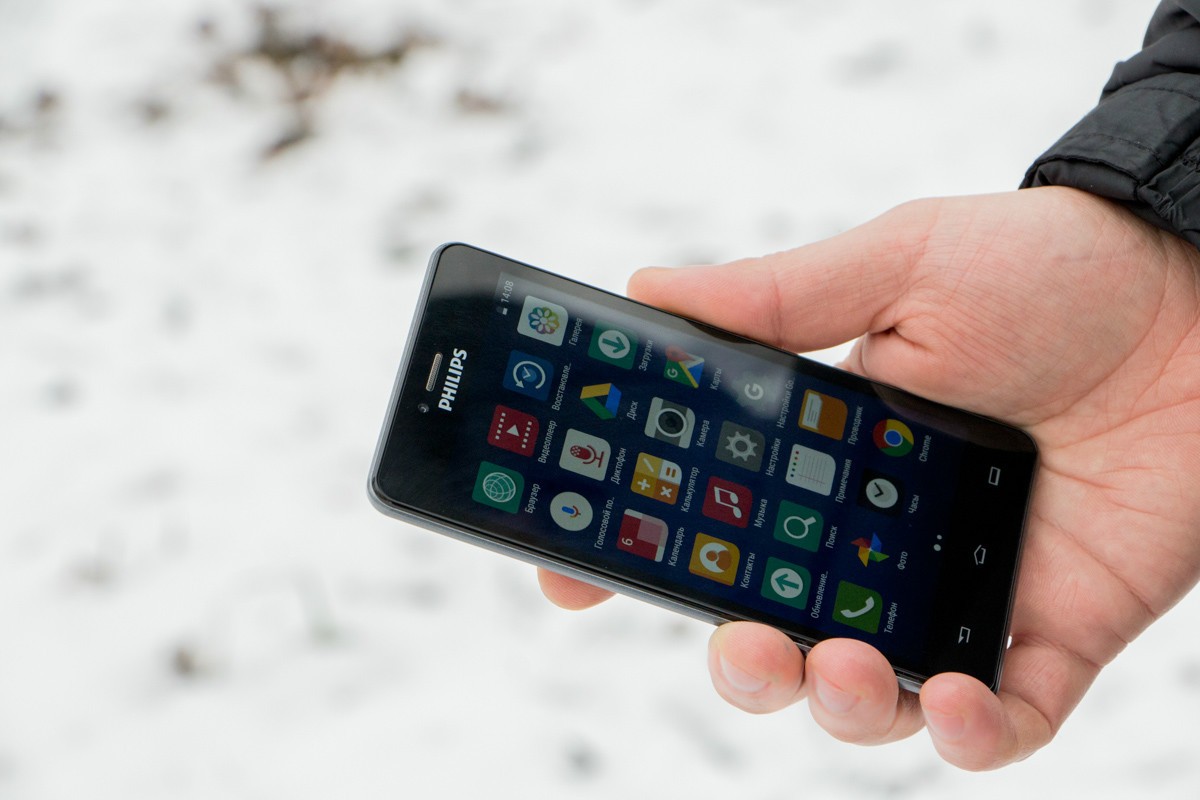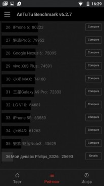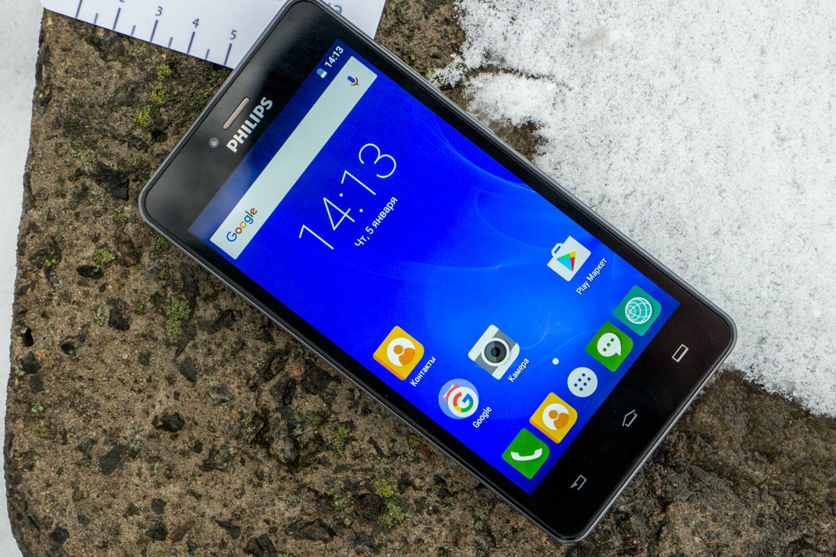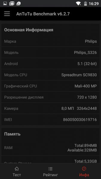 Что еще удобно, смартфон с ИК-портом решает проблему замены батареек в реальных пультах, а это и экономия денег, и мнимая, а для кого-то и вполне реальная, забота об окружающей среде. ОС и программыПомимо приложения для управления ИК-портом в смартфоне больше нет интересных предустановленных программ. Все, что нужно, скачиваем через Google Play Маркет. Единственное требование, чтобы софт поддерживал работу с ОС Android 5.1. Операционка улучшена фирменной оболочкой от Philips. В ней изменен дизайн ярлыков и некоторых приложений, включая «Камера». ДисплейЭкран – это далеко не слабое место обозреваемой модели. Даже бюджетный сегмент не повод ставить плохие матрицы решили в Philips и установили в S326 5-дюймовый HD IPS дисплей. Жаловаться на пикселизацию при разрешении 720х1280 точек и 320 dpi будут только очень требовательные покупатели. Сенсор хорошо отрабатывает нажатия даже на морозе до -10 градусов. Мультитач рассчитан на 5 одновременных нажатий. Аппаратно предусмотрен датчик освещения, так что яркость регулируется не только вручную. Диапазона ее изменений достаточно для удобной эксплуатации трубки в темноте и в солнечные дни. При переизбытке освещения картинка конечно выгорает, но в обычных условиях цвета на экране яркие и контрастные. Углы обзора достойные при отклонении в любую сторону. К плюсам дисплея стоит отнести наличие качественного олеофобного покрытия. Идеальным его не назовешь, ведь отпечатки все-таки собираются, но вот для их удаления много силы прикладывать не придется. Защищает верхний слой покрытие больше похожее на пластик, его от царапин уберегает немного выступающий корпус. Усилить защиту можно наклеив пленку из комплекта поставки. ЗвукПредусмотрена комплектацией и простая стереогарнитура. Ее с лихвой хватит для любителей общения через наушники или в качестве антенны для встроенного FM-радио. При этом звучание через мультимедийный динамик хорошее, правда, без басов. Максимальная громкость не запредельная, но позволяет услышать звонок даже в шумном месте. Разговорный динамик в Philips S326 без искажений передает голос собеседника и имеет достаточный запас громкости. Аппаратная начинкаЗа вычисления и поддержку мультимедийных функций в Philips S326 отвечает 4-ядерный процессор с частотой 1.5 ГГц. Это 32-битный модуль Spreadtrum SC9830, дополняет который графический ускоритель Mali-400 MP. В пару к ним установлен 1 ГБ оперативной памяти, которой достаточно для работы с основными приложениями. При этом смартфон без раздумий справляется с видео в HD разрешении, аркадными и логическими игрушками. Если есть желание запускать на обозреваемом устройстве требовательные к графике симуляторы, то готовьтесь к длительной их загрузке и необходимости уменьшать настройки по части реалистичности картинки. Ниже опубликованы результаты прогона устройства в основных тестах на производительность. ПамятьИз коробки пользователю на смартфоне доступно почти 5,5 ГБ из 8 ГБ встроенного накопителя. Если хотите больше, то можно установить карту памяти объемом до 32 ГБ. Подключение через USB-OTG не поддерживается. Из меню настроек можно изменить место для установки приложений: на карточку или непосредственно в устройство. Сети и ИнтерфейсыДвухсимник Philips S326 получил два отдельные слота под SIM карты формата micro, так что пользоваться услугами двух операторов не помешает даже установл