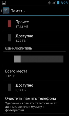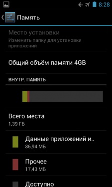 Из 4 ГБ официально заявленной памяти пользователь может работать с немногим больше трех: 1,4 ГБ - память телефона и чуть более гигабайта - встроенный FLASH-накопитель.