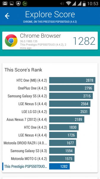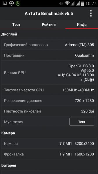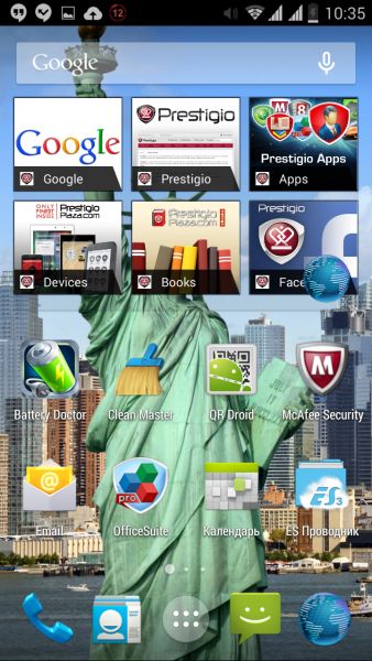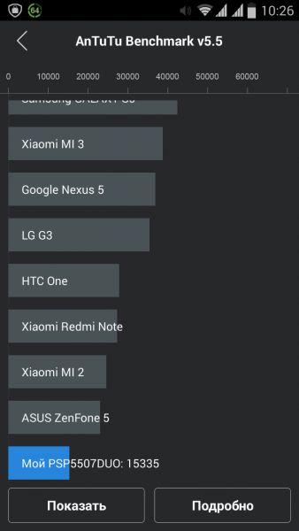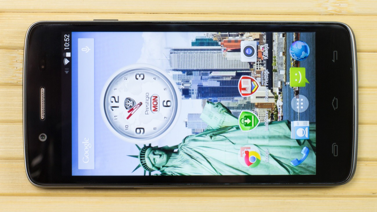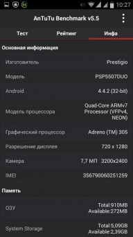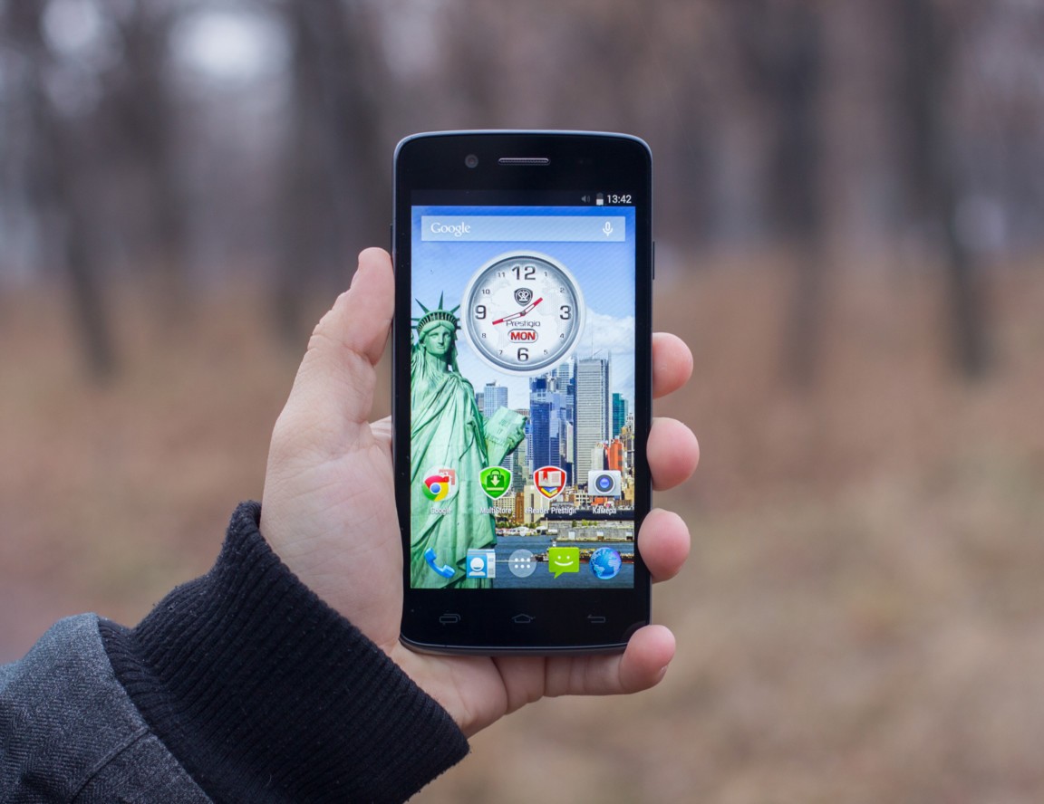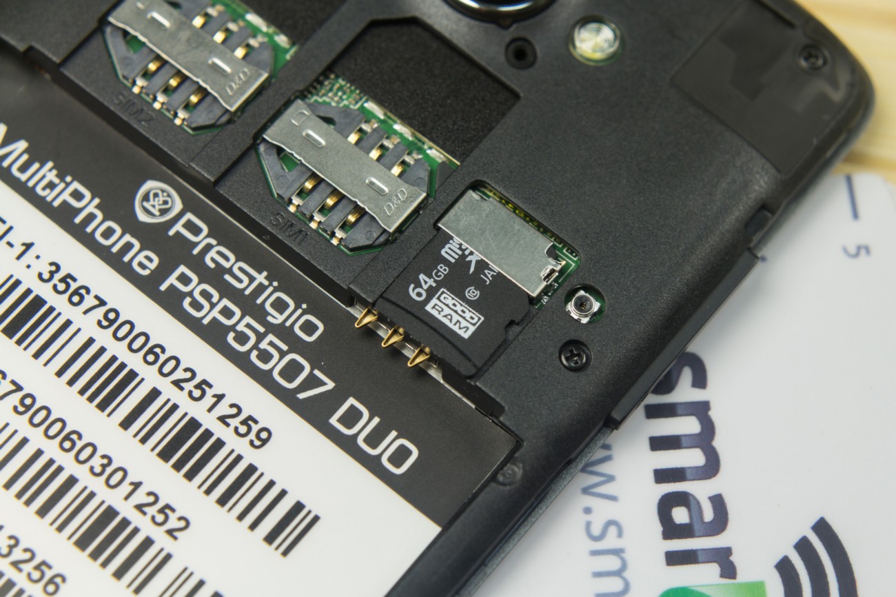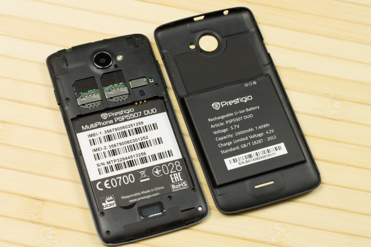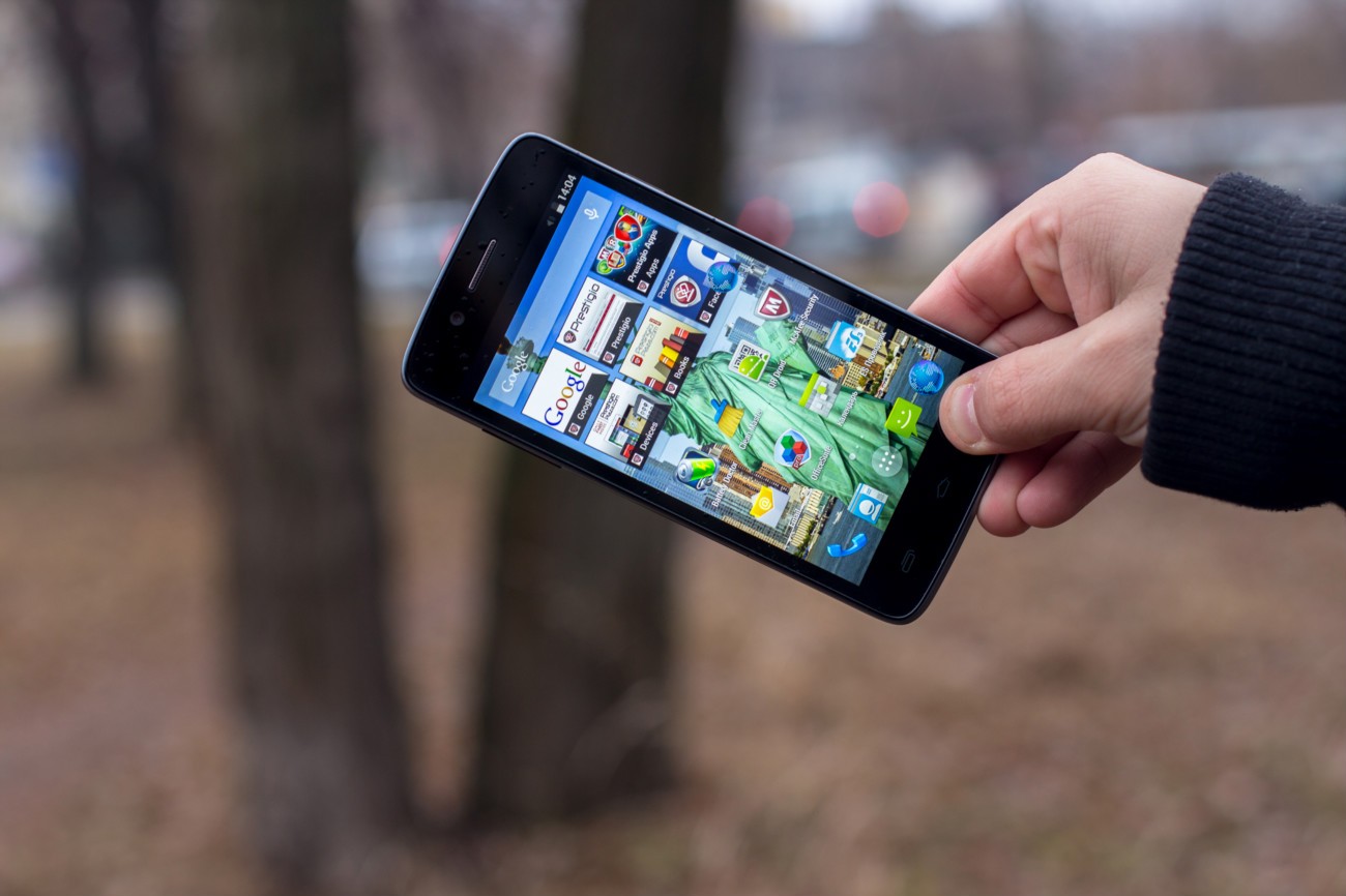 Дизайн и корпусВ плане дизайна тестируемый смартфон - больше рабочая лошадка, нежели икона стиля. Строгая классическая моноблочная внешность хорошо подчеркнута серебристой вставкой по всему ободу. Она разделяет лицевую часть, прикрытую стеклом Gorilla Glass, от фронтальной. Дополнительно экран защищается еще и корпусом. Последний немного выступает над дисплеем, чем помогает избежать трещин и прочих неприятностей, вызванных падениями. Металл в отделке не используется. Задняя крышка не глянцевая и не обычный софт-тач, на котором сразу после касания видны отпечатки пальцев. Это своего рода комбинация из приятного на ощупь не скользкого пластика с небольшой и едва видимой структурированной поверхностью. При определенном освещении может показаться, что цвет его даже и не черный, а насыщенный серый. Следы от касаний на нем не видны и из руки этот софт-тач смартфону выскользнуть не дает. Так что по части подбора материалов ставим оценку отлично. Сборка также на хорошем уровне. Добавлю, что на рынке еще доступна аналогичная нашей модель, но только в белом цвете. Исходя из стоимости Prestigio MultiPhone 5507 DUO, требовать от производителя узких рамок и минимальной толщины в нашем случае будет лишним. При весе в 160 грамм, что не так уже и мало, управлять на ходу смартфоном, держа его в одной руке, не очень просто, особенно, если пальцы у Вас не длинные. Есть проблема с тем, чтобы без перехвата дотянуться до сенсорных клавиш под дисплеем. Хотя, отмечу, что расположение кнопок питания и регулировки громкости удобное. Они соответственно справа и слева на ребрах, на одном уровне. Что касается остальных функциональных элементов, то на верхнем торце 3,5 мм аудиоразъем и порт microUSB, на ободе лицевой части микрофон, над дисплеем фронтальная камера на 2 МПикс. и датчики освещенности и приближения. С тыльной стороны по центру на пьедестале, украшенном серебристым ободом, расположили основную 8 Мпикс. камеру, одинарную вспышку и микрофон. В нижней части - прорезь под динамик громкой связи. Звучит он, кстати, под стать стоимости трубки. Во всем диапазоне звук ровный, без особых заходов в низкие и высокие частоты. А вот к разговорному динамику нет никаких претензий. Максимальной его громкости достаточно для разговоров даже в метро. Посторонние шумы и хрипы отсутствуют. Под задней крышкой расположился съемный аккумулятор, два слота под SIM-карты формата Mini и один для карт памяти. Так что пользователь на свое усмотрение может без труда расширить предлагаемое компанией хранилище из 5 ГБ до минимум 64 ГБ. Карты большего объема у нас просто не нашлось. Не забываем и о возможности использовать 200 ГБ бесплатного облачного хранилища Prestigio MultiCloud. Важно отметить, что поменять карту без того, чтобы снять аккумулятор, возможности нет. Аналогично и с симками. ДисплейКогда впервые включаешь смартфон, приятно удивляет хороший дисплей. Используется 5-ти дюймовая IPS-матрица с отличными углами обзора. Как трубку не крути и цвета, и видимость картинки остается на высоком уровне. На солнце информация с экрана читается, но только на максимальном уровне яркости. Заметил, что диапазон регулировки подсветки не очень большой. Перед сном, когда просматриваю интересные новости за день в полной темноте, мне не хватает ее минимума. Хотя, скорее всего, это проблема прошивки и со временем ее исправят. Сенсорн