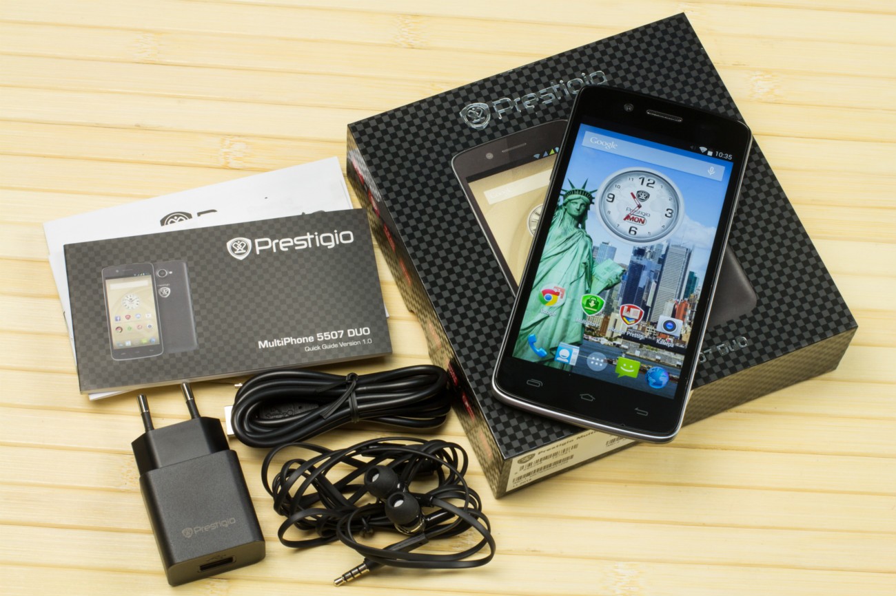 Обзор смартфона Prestigio MultiPhone 5507 DUO: трудяга без стероидовПервой мобильной новинкой, которая попала к нам на тестирование в 2015-м году, стал Prestigio MultiPhone 5507 DUO. Это доступный смартфон с актуальным для сегодняшнего дня разрешением экрана в 5 дюймов. Внутри 4-х ядерный Snapdragon и 1 ГБ оперативки. Цена трубки - 2199 грн. Какая производительность у этого аппарата и чем еще он может привлечь покупателя - далее в обзоре. Лень читать текстовый обзор? Смотрите видео-обзор...Комплект поставкиВ комплекте поставки с Prestigio MultiPhone 5507 DUO идут черные наушники-капельки с функцией гарнитуры и кнопкой ответа. Провод плоский, так что запутываться они будут чуть меньше обычного. Еще в коробке есть зарядное устройство и соответствующий кабель, ну и, конечно же, документация.