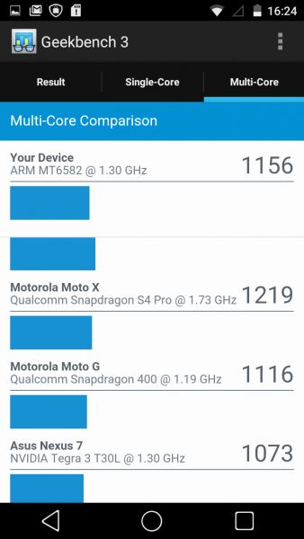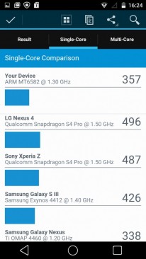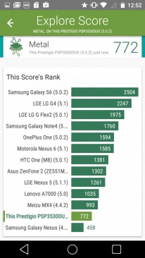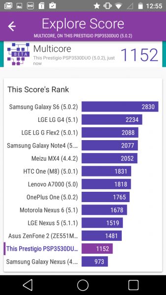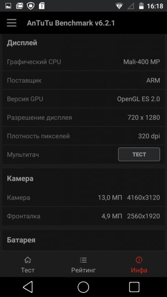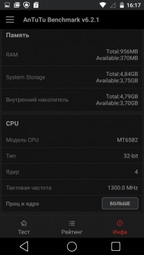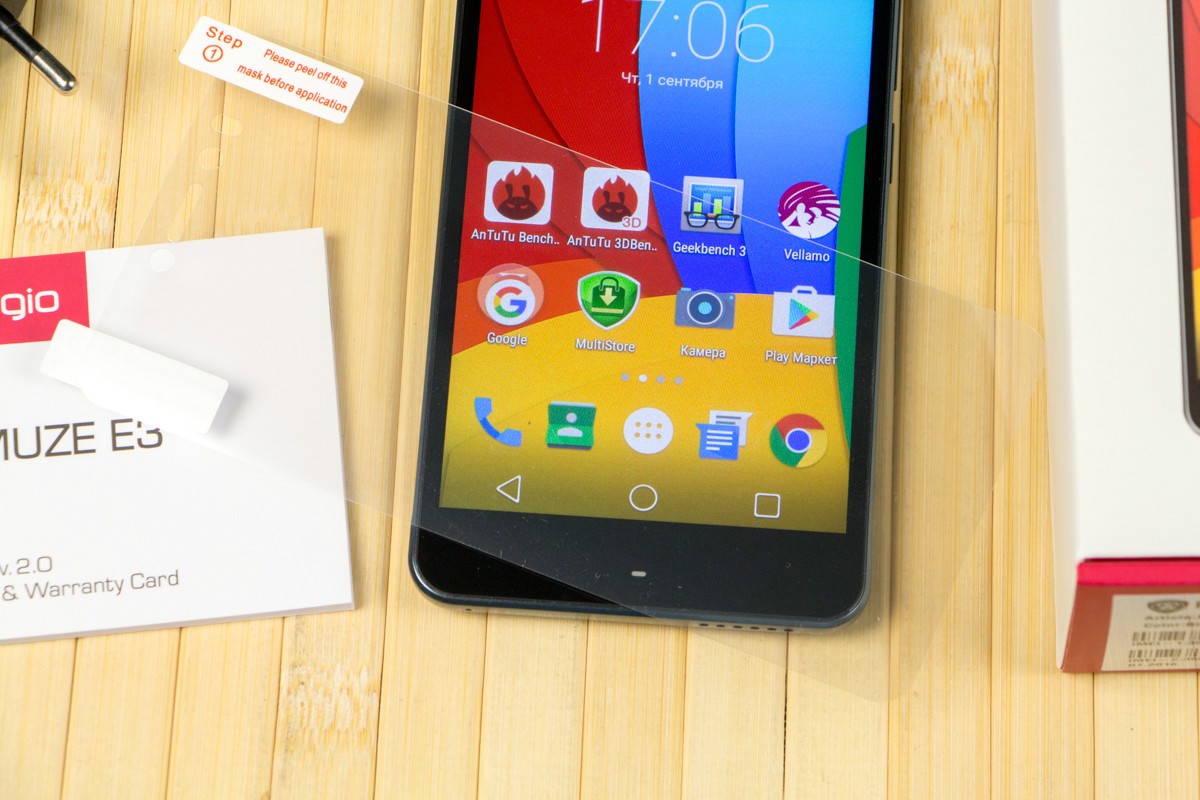 Дизайн и корпусСмартфон Prestigio Muze D3, если не обращать внимания на характеристики, идентичен модели Muze F3, который мы закончили тестировать буквально на прошлой неделе. Основное отличие - цвет корпуса, который также может быть золотым и белым. У нас он с черной тыльной панелью и ободом темного синего цвета. Материал - пластик, металла нет даже в ободке камеры. Сама крышка имеет выступающие элементы, которые не дают царапать фотомодуль в положении смартфона экраном вверх. В целом черно-синяя расцветка сочетается гармонично и не делает трубку скучной. Материал приятный и за время тестирования усомниться в своей выносливости повода не давал. Тыльная сторона не гладкая, так что скользить по руке устройство не будет. Расположение элементов управления удобное. Кнопки нажимаются с небольшим усилием и имеют приятный ход. Удобно реализована система оповещений с LED индикатором в нижней части лицевой панели. При необходимости его можно отключить в меню «Экран». Кстати, на ощупь кажется, что дисплей прикрывается стеклом, однако о его защитных характеристиках производитель не пишет, так что бережное отношение к нему рекомендуется. Над экраном расположились разговорный динамик, фронтальная камера и вспышка, а также датчики приближения и освещенности. Это даже больше, чем может предложить обычный бюджетник, ведь есть вспышка. Она одинарная, но светит мощно. Трубка разборная. Для двух SIM-карт стандартного размера выделено отдельные места, как, собственно, и для карты памяти. Крышка, которая их прикрывает, крепится плотно и не скрипит при сжатии. ЭкранВ очередной раз стоит поблагодарить производителя за то, что выбирает для своих смартфонов качественные матрицы - 5.3 дюйма, IPS. Пусть это только HD разрешение (1280х720 точек), а не Full HD, однако картинка яркая и контрастная, а пикселизация видна только при очень близком рассмотрении. Antutu показывает 320 dpi (278 ppi). Экран хорошо вытирается от отпечатков. Палец по дисплею скользит комфортно и сенсор четко определяет нажатия на него. Мультитач поддерживает пять одновременных прикосновений. Углы обзора достаточные при отклонении взгляда в любом направлении. Только при ярком солнце смартфон лучше держать прямо перед собой, тогда и информация на максимальной подсветке будет читаться без дискомфорта для глаз. Яркость можно регулировать вручную или отдать этот процесс на откуп датчика освещенности. Аппаратная платформаВ основе вычислительных возможностей Prestigio Muze D3 задействован процессор MediaTek MT6582M c 4-мя активными ядрами и максимальной частотой 1.3 ГГц, графический чип Mali-400MP2 и 1 ГБ оперативной памяти. Ниже приведены результаты прогона трубки через синтетические бенчмарки. Тесты на производительность показали скромные результаты. Однако в реальном пользовании смартфон позволяет без задержек запускать и просматривать видео в HD разрешении, популярные аркады и симуляторы. Лишь для небольшой части последних нужно при необходимости выставлять вручную более скромные параметры отображения графики. ПамятьЕмкость встроенного накопителя Prestigio Muze D3 8 ГБ. Из них пользователю под личные цели доступно всего 3,75 ГБ, так что без установки карты памяти объемом хотя бы на 16 ГБ не обойтись. Заявлено, что максимальный объем накопителя microSD ограничен 32 ГБ. Технология USB-OTG не поддерживается. АккумуляторВ модели Prestigio Muze D3 установле