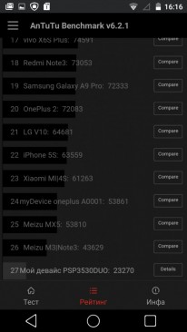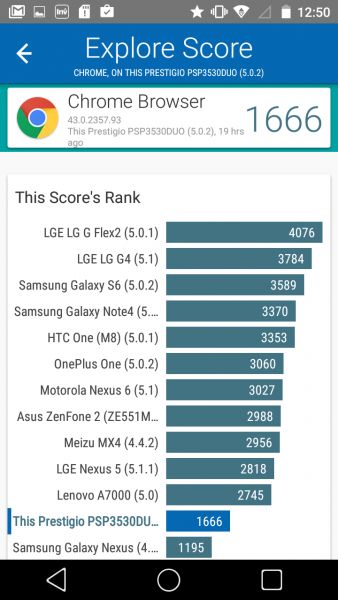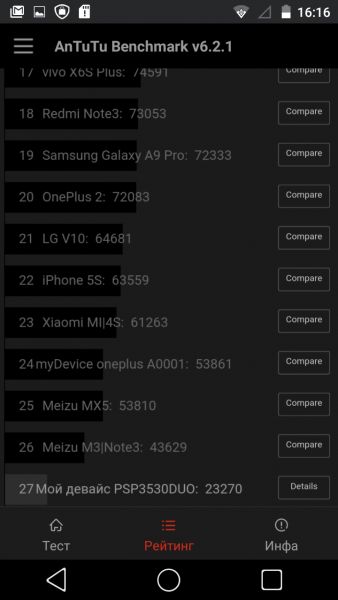 Результаты средние и говорят о том, что на звание переносной PowerBank устройство не претендует, да и ему самому он не нужен. Полный рабочий день устройство может выдержать без промежуточного подключения к сети. Стандартный для Android режим экономии заряда присутствует. ДинамикОба динамика Prestigio Muze D3 отрабатывают свою функцию даже лучше, чем это ожидаешь от смартфона с ценником на стыке бюджетного и среднего сегмента. При разговоре собеседников слышно хорошо, они на качество передачи голоса также не жаловались. Громкость мультимедийного динамика достаточная для любых ситуаций. По качеству его можно назвать достойным, но вот до восторга не дотягивает. В настройках есть система улучшения звука для наушников BesAudEnh и программный усилитель динамика BesLoudness. Музыку через свои наушники высокого качества слушать было приятно. В комплекте гарнитуры нет, зато есть защитная пленка, кабель microUSB-USB, зарядное устройство и необходимая документация, включая гарантийный талон. ОС и программыPrestigio Muze D3 работает под управлением операционной системы Android 5.0.2. По большому счету, это чистая версия, за исключением нескольких предустановленных приложений: Эволюция (игра), Dr.Booster (ускоритель работы софта), eBay, File Commander, Investing (сводка биржевых индексов), Jungle Heat (игра) и лаунчер Start. Все, что вам не нравится, можно удалить и на его место скачать новое. Также стоит упомянуть о плавающем окне. Оно позволяет набрать номер, например, поверх открытого ролика в Youtube. КамерыОсновная и фронтальная камеры - это главное отличие между смартфонами Prestigio Muze D3 и Muze F3. Разница в цене в 300 грн, а разница в модулях - 13 Мпикс. против 8 Мпикс. в основной матрице, и 5 Мпикс. против 2 Мпикс. во фронтальной. Конечно же, это повлияло на качество фотографий и видео наилучшим образом. - тестовые фото Как видите, изображения получаются четкие и контрастные. Цветопередача хорошая при любых погодных условиях. В темноте также можно делать хорошие кадры. И заслуга тут не только 13 Мпикс. матрицы, но и тройной вспышки. Обе камеры Muze D3 имеют большое количество базовых и продвинутых настроек и режимов, в числе которых опция «Обнаружение лиц» и «Красота лица». Также предоставляются функции редактирования и обработки. Для тех, кому трудно выставить на местности трубку строго параллельно горизонту, придумали регулятор наклона. Реально помогает. Фронтальная вспышка часто вытягивает качество фотографий на селфи-камеру. Видео она записывает в максимальном разрешении 640х480, а основная в Full HD(https://youtu.be/isset1DGzTI). При записи предусмотрен режим шумоподавления и электронная стабилизация изображения. ВыводыЧто ж, Prestigio Muze D3 не способен поразить нас своими достижениями в тестах на производительность и не блестит металлической кромкой. Вместе с тем он и не стоит огромной суммы денег, за которую может болеть голова в случае чего. При всем этом смартфон радует качественным дисплеем и возможностью воспроизводить видео контент в HD разрешении, а также отличными снимками на свою основную 13 Мпикс. камеру. Субъективно Muze D3 заслуживает на звание победителя в номинации цена-качество, ведь его достоинства только укрепляются заявленным ценником в 2599 грн.