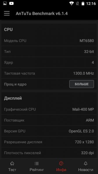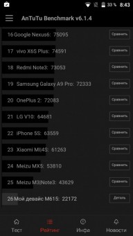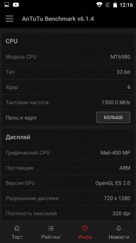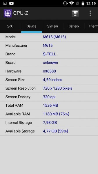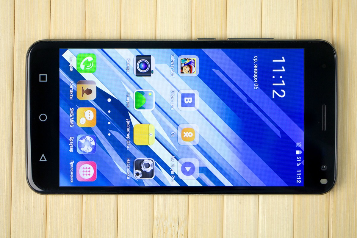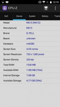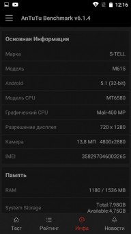 Передняя панель аппарата от металлической основы отделена тонкой пластиковой рамкой черного цвета и по краям немного выпуклая. Сам производитель о 2.5D стекле не упоминает, но эффект очень похож. Нет информации и о наличии защитного стекла, однако, замечу, за все время тестирования обошлось без царапин на экране. Под дисплеем находятся три сенсорные кнопки управления без подсветки, а над ним прорезь разговорного динамика, глазок 5Мп камеры, датчик приближения и LED-индикатор. Несмотря на демократичный ценник S-TELL M615 не только хорошо выглядит, но еще и отлично собран - ничего не люфтит и не скрипит. Механические кнопки управления, которые обустроены здесь нетрадиционно на левом торце, сидят плотно, имеют четкий ход с ощутимым откликом. Дотянуться до них, удерживая аппарат одной рукой, труда не составит. А вот что касается навигации по меню M615 одной рукой, то 5 дюймов для легкого управления все-таки многовато, хотя в целом габариты трубки небольшие - 142?71?8 мм при весе вес 136 грамм. Правая его «боковушка» отдана под два выдвижных слота – один для nanoSIM-карты, а другой спаренный для симки формата micro и карты памяти. 3.5 мм аудиовыход у M615 находится на верхнем торце. На нижнем обустроен microUSB порт и две решетки. За одной из них спрятан мультимедийный динамик, а вторая используется для декорации и для маскировки микрофона. ДисплейЭкран смартфона выполнен по IPS-технологии, имеет диагональ 5 дюймов и разрешение 1280х720 точек. Пикселизация становится заметна только при очень близком рассмотрении. Углы обзора хорошие, а вот насыщенности и контрастности дисплею не хватает – на солнце он ощутимо "слепнет". Настройками помимо ручной регулировки яркости подсветки предусмотрена опция MiraVision с тремя режимами отображения. В «Пользовательском», в частности, можно самостоятельно настраивать такие параметры экрана как контраст, насыщенность, цветовая температура, динамическая контрастность и пр. Чувствительность сенсора хорошая - все нажатия, смартфон распознает без ошибок и способен одновременно обрабатывать до 5 касаний. Аппаратная начинка и производительность«Железо» S-Tell M615 вполне соответствует классу смартфона. Используется бюджетный чип MediaTek MTK 6580 c четырьмя ядрами. Тактовая частота - 1.3 ГГц, графика Mali 400MP1. А вот объем оперативной памяти приятно удивил - 1.5 ГБ. Смартфон без проблем воспроизводит HD-видео, а вот любителям ресурсоемких игр я бы порекомендовала присмотреться к более мощным трубкам S-Tell – графика M615 в играх из разряда Asphalt 8 не блещет. С простыми аркадами и остальными задачами гаджет справляется хорошо, стандартный интерфейс работает плавно. Все это управляется операционной системой Android 5.1 Lollipop с большим количеством предустановленных программ, среди которых, в частности, браузер Opera mini, приложения социальных сетей вконтакте, facebook и однокласники, офисный пакет Docs to Do, читалка Cool Reader, FM-радио и мн др. ПамятьОбъем встроенной памяти S-Tell M615 составляет всего 8 ГБ, но ее можно расширить с помощью карт памяти microSD максимальным объемом до 32 ГБ. И других способов расширения не предусмотрено. Коммуникационные возможностиНабор коммуникационных возможностей смартфона представлен модулями беспроводной связи Wi-Fi 802.11 b/g/n и Bluetooth, есть также приемник навигационной системы GPS. Кроме того, как уже упоминалось ранее, в наличии S-Tell M615 два слота для SIM-карт, работа
