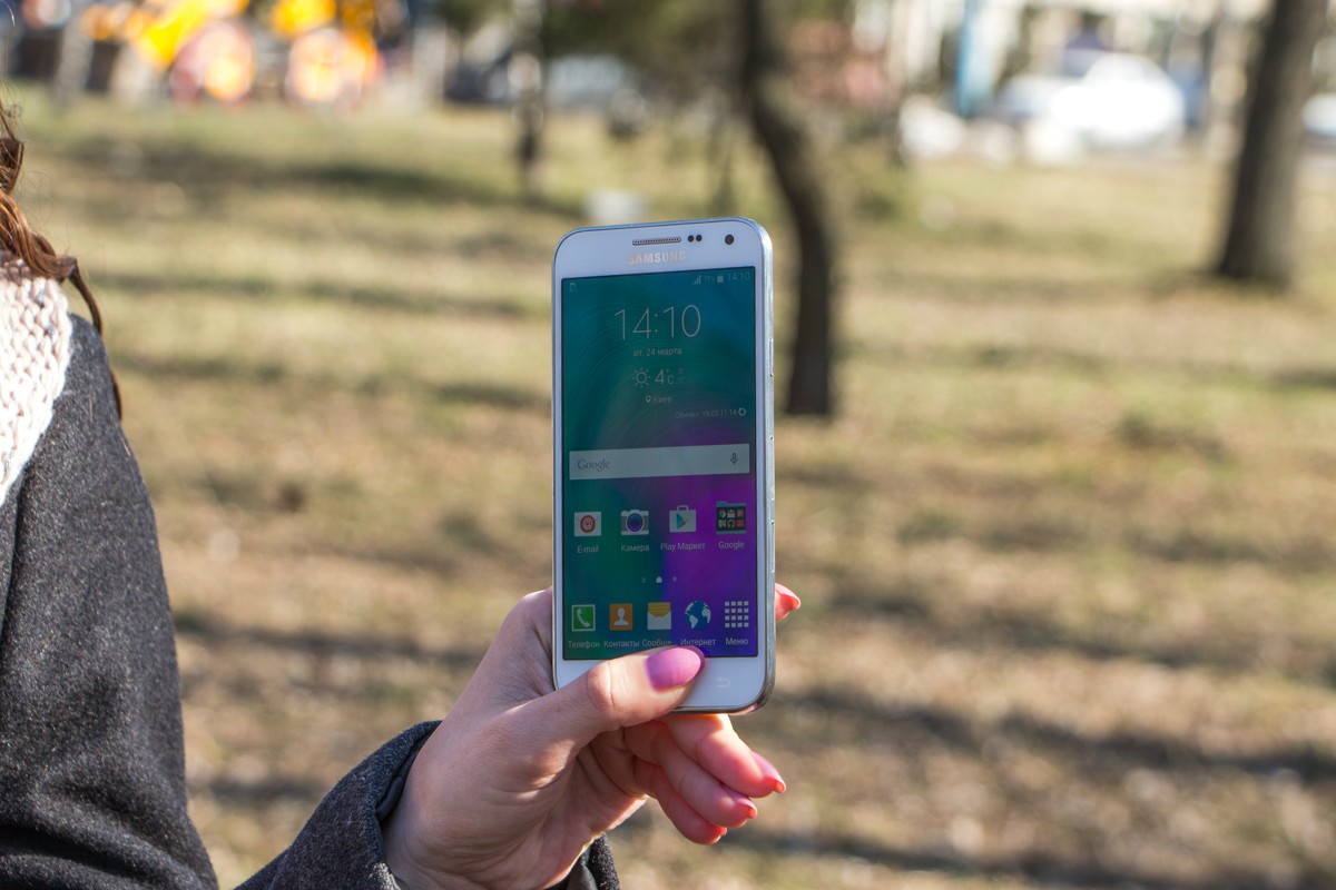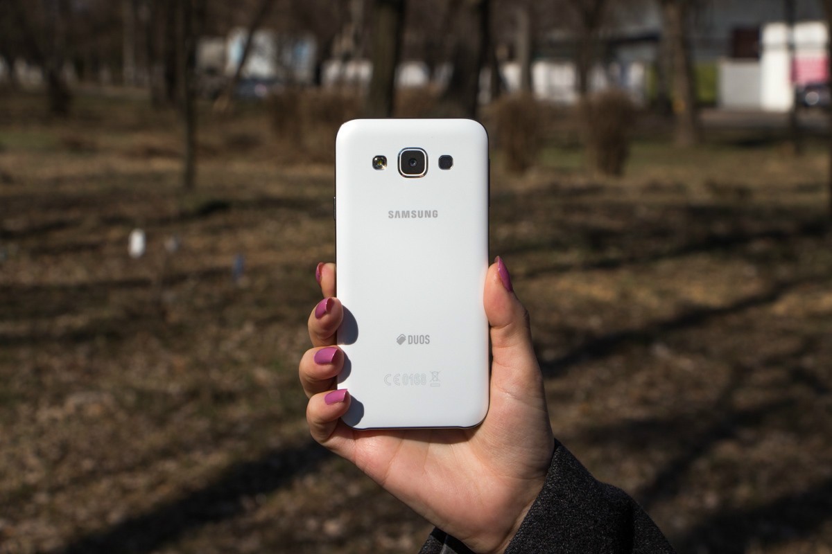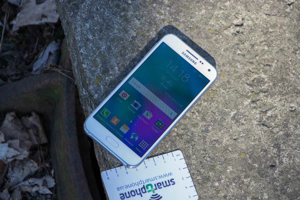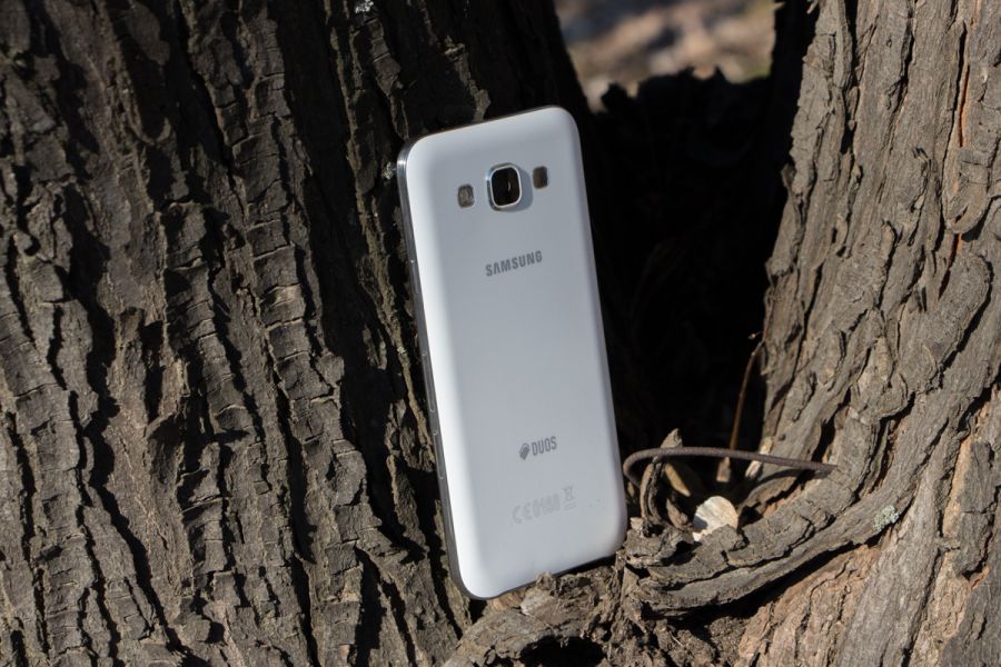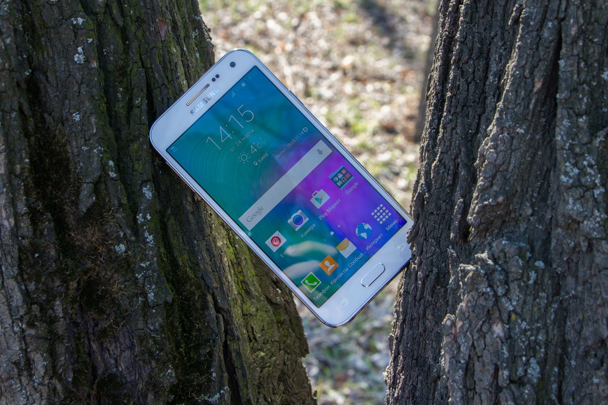 Обзор смартфона Samsung Galaxy E5 SM-E500H – «кореец» среднего дивизионаЗнакомимся с возможностями представителя новой линейки среднего ценового сегмента от Samsung. 4-ядерный процессор и 1.5 ГБ ОЗУ «под капотом», 5-дюймовым Super AMOLED HD-дисплей, далеко не самый слабый аккумулятор, плюс дизайн в стилистике аппаратов металлической A-серии и ценник в $270. Насколько хорош двухсимочный Samsung Galaxy E5 и что он может предложить пользователю, читайте ниже. Лень читать текстовый обзор? Смотрите видео-обзор...ДизайнНе стоит задерживать дыхание в предвкушении кардинально нового дизайна - Galaxy E5 во многом похож на гаджеты более премиальной металлической A-линейки, вот только на смену металлу здесь пришел пластик. Впрочем, эту «подмену» выдает здесь лишь рамка вокруг корпуса - явный пластик с фактурой «под металл». А вот тыльная панель E5, как и в гаджетах A-серии, получила специальное не скользящее и не собирающее отпечатки пальцев покрытие, которое может быть окрашено в черный, коричневый или, как в нашем случае, в белый цвет. В ее верхней части обустроен немного выступающий над поверхностью объектив 8Мп камеры, LED-вспышка и маленькая квадратная решетка мультимедийного динамика. Чуть ниже нанесен логотип компании-производителя. Передняя панель девайса в свою очередь примечательная металлической решеткой разговорного динамика, набором датчиков, глазком 5Мп камеры, механической кнопкой «Home» и двумя сенсорными – «Меню» и «Назад», загорающимися при включении телефона. Что касается разъемов и элементов управления на торцах – слева кнопка питания и два слота для SIM-карт, справа – качелька регулировки громкости, к которой приходится "тянуться", сверху – микрофон шумоподавления, а снизу порт microUSB, 3.5 мм аудиоразъем и второй микрофон. Сборка деталей – без нареканий, все элементы отлично подогнаны, ничего не скрипит и не болтается. Смартфон удобно и приятно держать в руках – он тонкий и легкий, ход кнопок короткий и четкий, а пластик изготовления корпуса высокого качества. Для удобного взаимодействия с гаджетом одной рукой на ходу здесь предусмотрены сразу два режима: «Управление одной рукой» и «Простой режим экрана». Дисплей5-дюймовый дисплей Galaxy E5 выполнен по технологии Super AMOLED. Он яркий и контрастный, имеет отличные углы обзора и тонкие боковые рамки - за счет чего визуально кажется еще большим. Его разрешение - 1280х720 точек, а плотность пикселей на дюйм - 294. Если не вглядываться, пикселизация не видна - картинка гладкая и крайне приятная глазу. Автоматическая регулировка подсветки здесь почему-то не предусмотрена, зато можно включить автонастройку яркости экрана в зависимости от режима отображения для сохранения батареи, выбрать один из четырех режимов работы дисплея, а также активировать функцию «На улице», после чего яркое солнце никоим образом не будет мешать комфортной работе с E5. Технология мультитач позволяет обрабатывать 10 одновременных прикосновений. Ну и еще одна приятная особенность - хорошее олеофобное покрытие – палец по экрану скользит легко, отпечатки пальцев малозаметны и устраняются быстро. А вот о защитном стекле в случае с E5 производитель не упоминает, но из двухнедельного опыта использования могу сказать, что оно прочное. ПамятьВ распоряжении пользователя Galaxy E5 16 ГБ встроенной памяти, а в дополнение к этому — возможность вставить microSD-карту объе