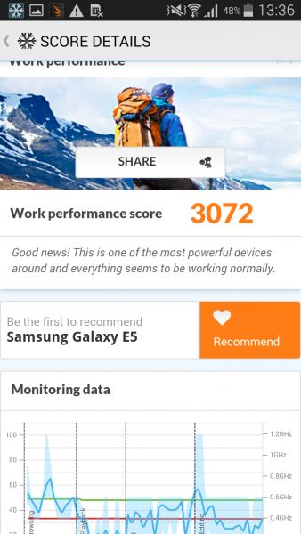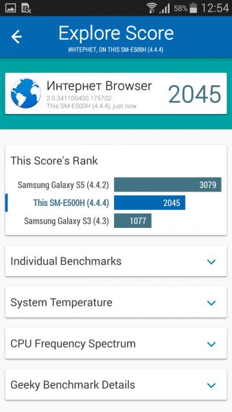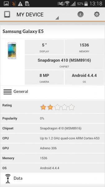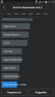 ПОGalaxy E5 работает под управлением ОС Android 4.4.4 KitKat с фирменной оболочкой TouchWIZ, но обновление до Android Lollipop производителем обещано. Интерфейс, расположение пунктов меню и разделов настроек аналогичны таковым в ранее тестируемом Galaxy A3. Поддерживается возможность работы одновременно в двух окнах, управление жестами, правда, их набор минимален, предусмотрен режим приватности, боковая панель виртуальных клавиш и новостная панель Briefing. ВыводыВ целом, можно сделать вывод, что Samsung Galaxy E5, хоть и дороговат на старте продаж - $270, зато по таким параметрам как репутация бренда, надежность сборки, внешний вид, комфорт управления, а также сбалансированность работы аппаратной и программной части, обходит большинство своих конкурентов в ценовом сегменте до $300. Чего здесь недостает, так это автоматического регулирования яркости дисплея, ну и свеженькой Android Lollipop. Впрочем, что касается оси, то вряд ли производитель со временем «не выкатит» обновление — смартфон то получился стоящим внимания.