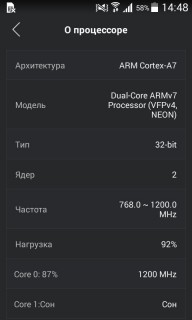 4 ядра, MediaTek MT6582М, 1,3 ГГц | 2 ядра, Intel Atom Z2520, 1,2 ГГц, |
