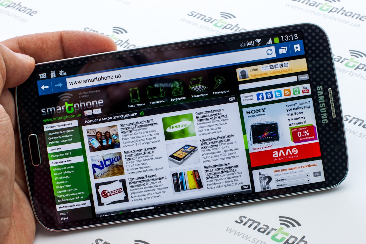 Обзор смартфона Samsung Galaxy Mega 6.3 – почти как планшетИнтересная альтернатива Huawei Ascend Mate и некоторым другим решениям в сегменте смартфонов с дисплеем шесть и более дюймов. Кому может быть интересно такое устройство, и какие еще возможности в нем «скрыты» мы и поговорим в этом обзоре. Лень читать текстовый обзор? Смотрите подробный видео-обзор...Материалы и качество сборкиЕсли вы, наши уважаемые читатели знакомы с обзором смартфона Samsung Galaxy Mega 5.8, уверен, вам не составит никакого труда заметить, что рассматриваемая в этом обзоре модель сложена строго «по стопам младшенькой». Очевидно, что производитель и не пытался менять внешний облик трубки, уделив внимание лишь «внутренностям». Корпус смартфона – это сочетание поликарбоната, пластика под металл, а также стекла Gorilla glass III. Последним «от корки до корки» прикрыта вся передняя панель. «Металлический» пластик реализован в формате окантовки, ну а вся тыльная панель из поликарбоната или, проще говоря, пластика который сложно поцарапать. Вот такой вот «винегрет»! Качество сборки корпуса, даже не смотря на инженерный статус самого аппарата на высоком уровне - ни люфта, ни скрипа материалов. Швы и зазоры также нареканий не вызывают. Обустройство функциональных элементов с точки зрения пользователя вполне неплохое. Но вместе с тем, учитывая весьма немаленькие ширину и длину трубки, спаренную кнопку регулировки громкости звука, было бы интереснее видеть ну, например, немного ниже кнопки включения/выключения питания аппарата. Пусть я буду банальным, но так попросту удобнее регулировать громкость звука во время разговора. С крышкой аккумуляторного блока совершенно никаких проблем. Снять ее очень легко. Выполнение обратной процедуры также никаких проблем не вызывает. Крепление на панель надежное – люфт между крышкой и корпусом смартфона не отмечен. ДизайнВо внешности Galaxy Mega 6.3, как, впрочем, и в Galaxy Mega 5.8 больше всего наследственного от флагмана этого года Samsung Galaxy S4 (с обзором знакомимся здесь). Разумеется, утверждать, что заимствование дизайна со своих же трубок это хорошо или плохо нельзя! Но и вместе с тем, быть может, есть резон поискать других дизайнеров!? Эргономика функциональных элементовТеперь о кнопках, разъемах и другой «пузатой мелочи». Передняя панель смартфона производителем условно разделена между огромным дисплеем, двумя сенсорными и одной аппаратной кнопкой, прорезью внутреннего динамика, глазком фронтальной 2 Мп камеры и всевозможными датчиками. Вся тыльная панель прикрывается крышкой аккумуляторного блока. В теле ее глазок основной 8 Мп камеры со светодиодной вспышкой, а также вывод динамика громкой связи. Здесь же при помощи специальных красок нанесен логотип компании-производителя. На правой боковой панели помимо кнопки включения/выключения питания аппарата имеется также небольшой зазор, уготованный для того, чтобы пользователь мог снять крышку аккумуляторного отсека. С противоположной «боковушки» открывается доступ к спаренной кнопке регулировки громкости звука. На верхнем торце 3,5 мм разъем для подключения традиционных наушников, ИК-порт, а также один из выводов микрофона. Еще один вывод микрофона на нижней грани. Здесь же находится и порт Micro-USB. Краткие технические спецификации