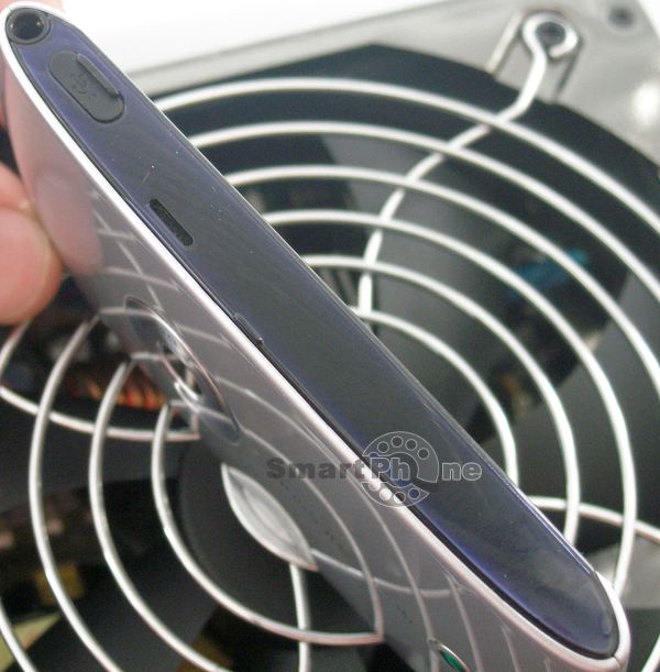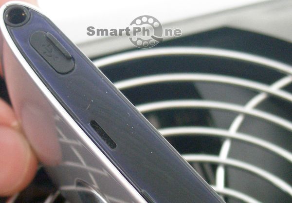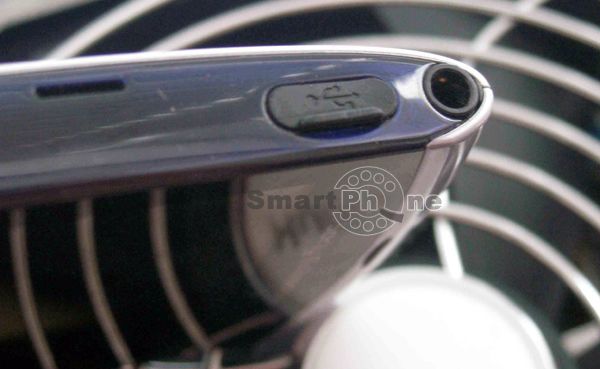 На левой панели виднеется 3,5 мм разъем для подключения проводной гарнитуры, micro-USB разъем кабеля зарядки/шнура синхронизации с ПК, а также небольшая прорезь динамика громкой связи.
