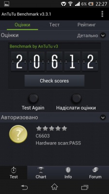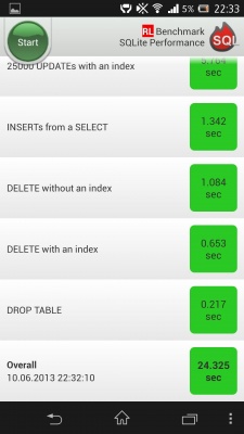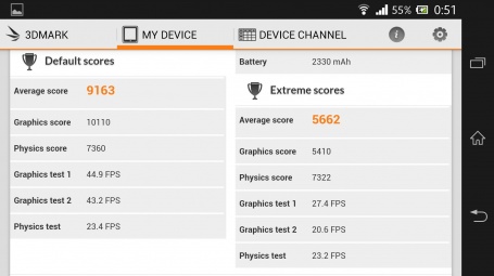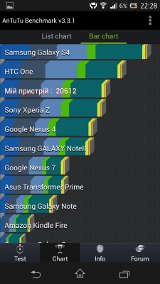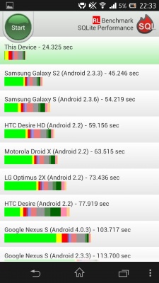 Емкость встроенного аккумулятора Sony Xperia Z - 2330 мАч, это значительно меньше, нежели у S4 (2600 мАч) и чуть-чуть лучше, чем у HTC One (2300 мАч). По словам производителя, батарея такой емкости обеспечит до 11 часов в режиме разговора (2G) и до 14 часов (3G). Бенчмарк Батарея HD показал нам следующие возможности аккумулятора.
