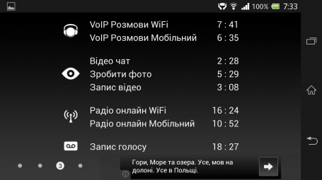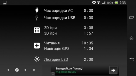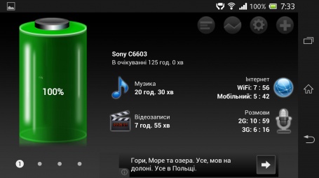 А вот на практике после 1,5 часов просмотра видео на YouTube со 100% заряда осталось 66%, еще 1,5 часа прослушивания музыки и уже 58%, 40 минут игры в Cut the Rope и на счету у нас 40% и это все при включенном Wi-Fi. С такими показателями одного полного заряда батареи Sony Xperia Z вполне хватит на целый день в режиме активного использования смартфона.