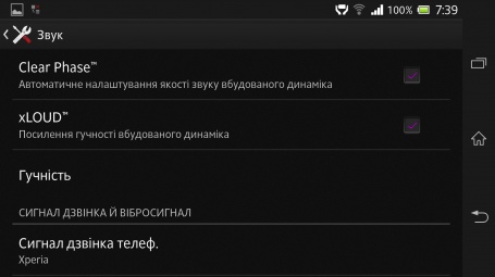 Качество звука, воспроизводимого встроенным динамиком, можно улучшить с помощью предусмотренных в смартфоне технологий Clear Phase и xLOUD. Первая является автоматической настройкой качества его звука, а вторая усиливает его громкость.