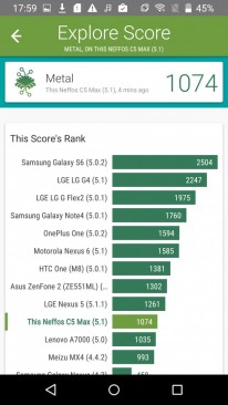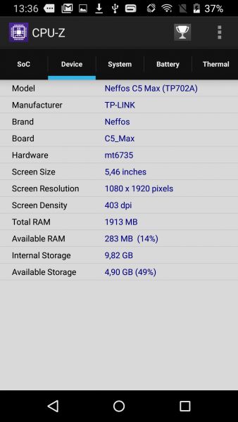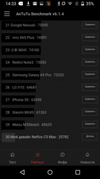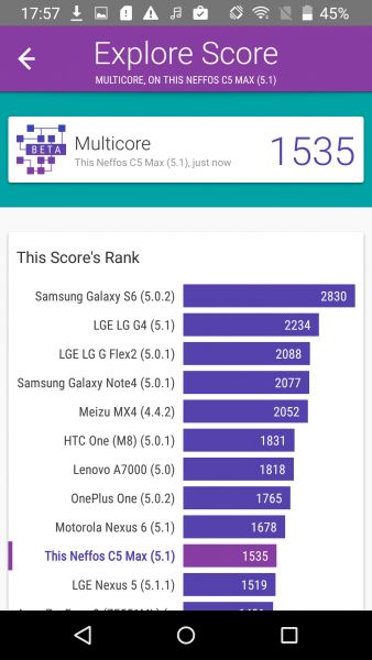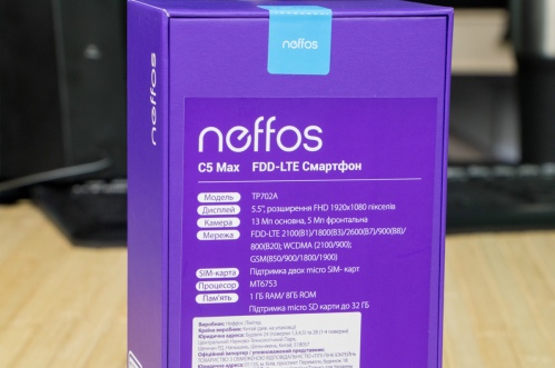 Обзор смартфона TP-LINK Neffos C5 Max (TP702A)Модель с ярким 5.5-дюймовым Full HD экраном, 8-ядерным процессором, 2 ГБ ОЗУ, аккумулятором на 3040 мАч и камерой на 13Мп. Но и этим достоинства 200-долларового TP-LINK Neffos C5 Max не исчерпываются. Больше подробностей далее в обзоре. Комплект поставкиНачнем традиционно с комплектации. В яркую фиолетовую коробку помимо самого Neffos C5 Max производитель положил адаптер питания, кабель microUSB-USB, инструкцию и гарнитуру с кнопкой ответа и дополнительными клавишами регулировки громкости. Замечу, наушники достаточно удобно «сидят» в ушах, однако из-за особенностей конструкции на максимуме звучания все же частично «выпускают» звук наружу. Дизайн и функциональные элементыДизайн Neffos C5 Max ничем не отличается от внешности других устройств серии Neffos – если бы не логотип производителя, спереди его можно было бы легко перепутать с LG G3. Модель фактически закована в пластик, металлическими остались лишь кнопка питания и качелька регулировки громкости на правой «боковушке». Последние, хотя и не особо выступают за пределы корпуса, благодаря специальной текстуре легко находятся на ощупь. Левый торец смартфона лишен каких-либо функциональных элементов. На нижнем расположен порт micro-USB и микрофон, а верхний занимает 3.5 мм аудиовыход. Вверху тыльной панели находится микрофон шумоподавления, объектив 13Мп камеры и двойная светодиодная вспышка. Задняя крышка смартфона, кстати, съемная. Под ней обустроены отдельные слоты для двух microSIM-карт, поддерживающих работу в 2/3 и 4G сетях, и карты памяти microSD. Передняя панель гаджета от задней отделена зеркальной пластиковой рамкой. Над 5.5-дюймовым экраном обустроена решетка разговорного динамика, объектив 5Мп камеры, LED-индикатор, датчики освещения и приближения. Под дисплеем лишь логотип производителя, так как кнопки управления здесь экранные. Из-за большой диагонали экрана Neffos C5 Max получился довольно габаритным - 152х76х8.95 мм при весе 161 г, поэтому управлять одной рукой им, ввиду еще и отсутствия специального режима, неудобно. Однако надо отдать должное производителю, в стремлении сделать корпус Neffos C5 Max комфортнее в обращении он использовал матовый пластик. Материал качественный и нескользящий, но в черном исполнении в отличие от белого довольно маркий. ЭкранNeffos C5 Max оснащен большим экраном на 5.5 дюймов. Дисплей выполнен по технологии IPS и имеет разрешение 1920х1080 точек, так что говорить о пикселизации не приходится. Картинка на экране смотрится приятно, цвета яркие, а углы обзора приближаются к идеальному значению в 178 градусов. Так что среди всех мобильных новинок T-LINK именно эту трубку я бы выбирала, будучи любителем посмотреть фильм или почитать книгу со смартфона. Из параметров экрана можно регулировать только яркость подсветки. Причем благодаря наличию встроенного датчика освещенности делать это можно не только вручную, но и автоматически. К преимуществам дисплея C5 Max могу также отнести защиту в лице стекла Gorilla Glass и качественное олеофобное покрытие, не позволяющее оставаться на экране отпечаткам пальцев и улучшающим тактильные ощущения от работы с тачскрином смартфона. Последний, к слову, безошибочно распознает до 5 одновременных касаний. Аппаратная начинка и производительностьПо части «железа» C5 Max самый мощный среди всех устройств линейки Neffos. За его производительность отвечает 8-ядерный п