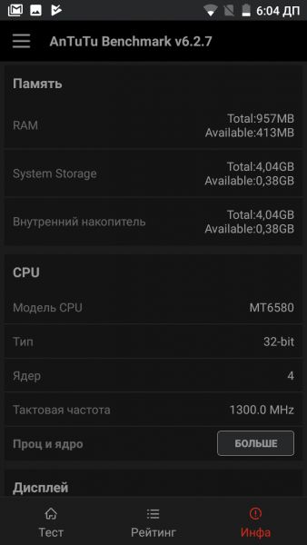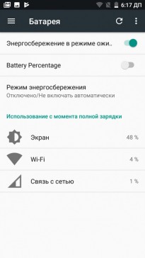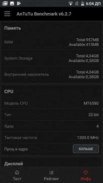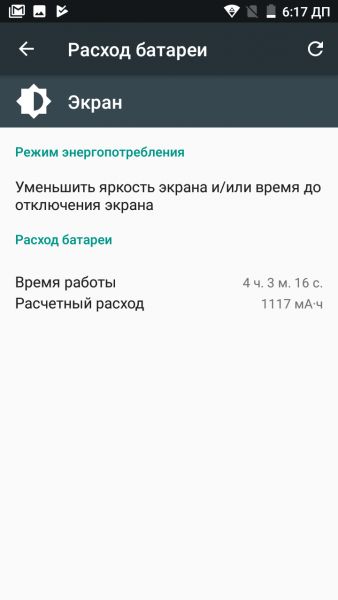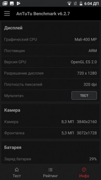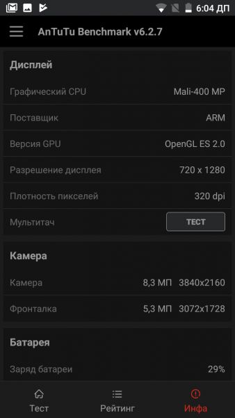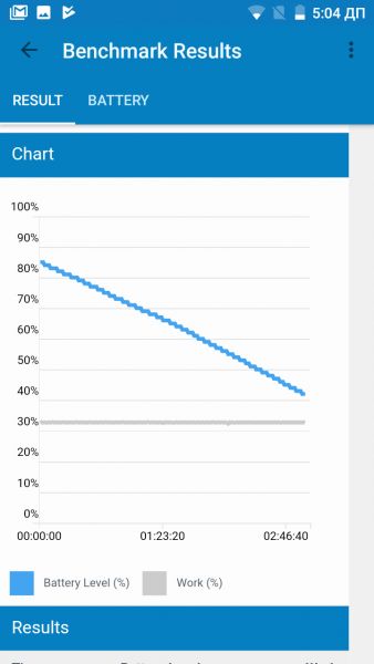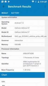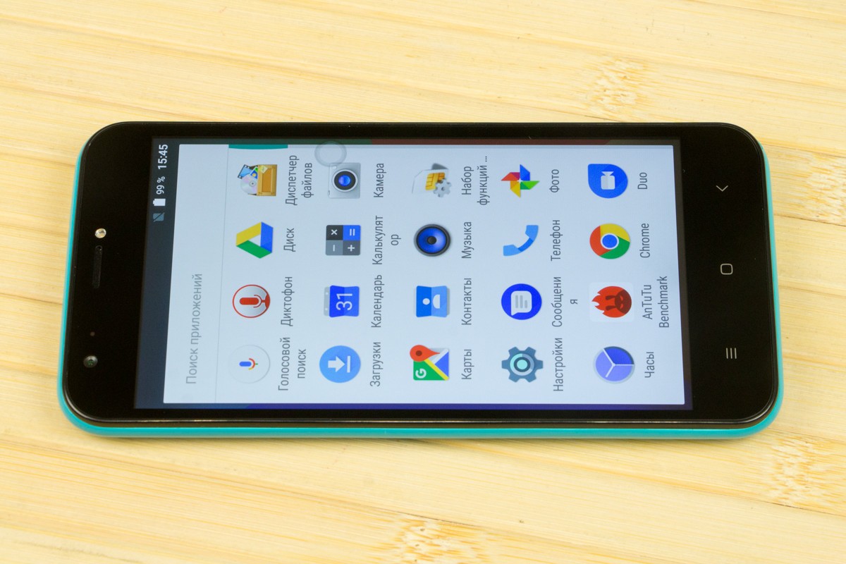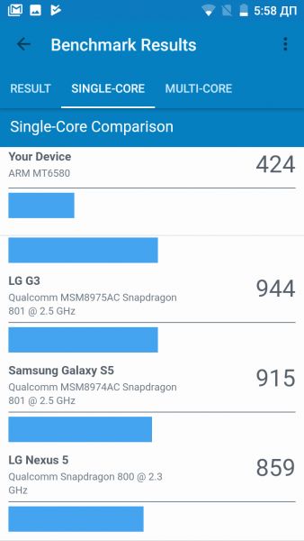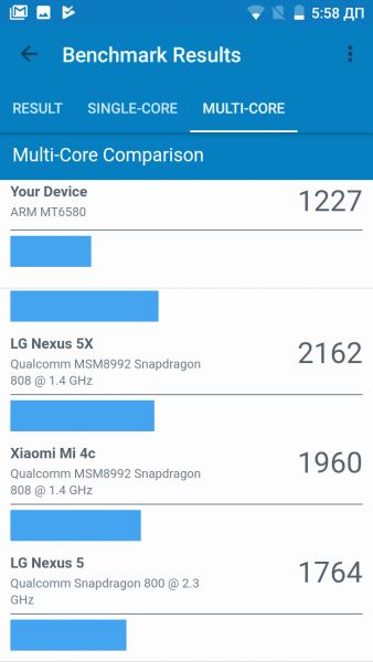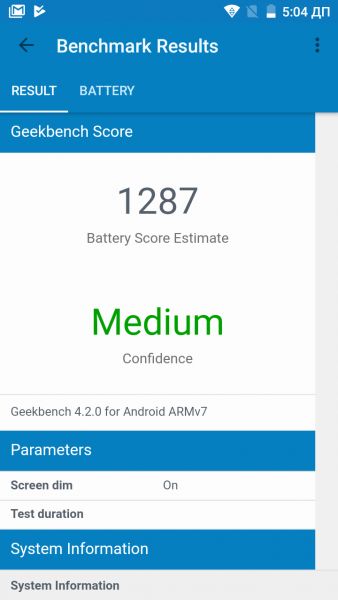 Батарея «Скромные» 2500 мАч, которыми уже никого особо не удивишь. Но, это лишь на первый взгляд. На самом деле это очень большая батарея, если исходить из характеристик устройства: не слишком производительный, но достаточно энергоэффективный процессор, экран с HD разрешением и размером в 5 дюймов. При таких параметрах заявлено время работы от 230 до 368 часов, в режиме ожидания. Реальный срок работы – около 4 дней без подзарядки, при среднем использовании всех функций телефона (4 часа активной работы дисплея за все время), что в принципе не противоречит заявлениям производителя. Уже традиционный тест в Geekbench 4 выдал 1287 баллов. Как и прежде не стоит придавать этому слишком много значения, так как он появился недавно и еще не собрал валидную статистику для сравнений. Впрочем, подобный результат выдает большинство устройств с ценником до 150 долларов. Если говорить более детально, в цифрах, то результаты такие: