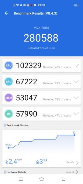 Отдельно поговорим про видео. Vivo X50 может записывать 4K со скоростью 30 кадров в секунду с основной камеры. Видео, записанные при дневном освещении, были насыщенными, с правильной цветопередачей. Съемка в условиях низкой освещенности понравилась своей четкостью и детализацией. Не идеально, но точно на порядок лучше среднего. Советую также попробовать функцию автоматического отслеживания движения. И обратите внимание на стабилизацию в отснятых мной роликах! Подвожу итог по камере. Vivo X50 - один из лучших камерофонов, доступных на рынке прямо сейчас. В нем нет 5-осевой стабилизации OIS и объектива перископа с 60-кратным увеличением, которые предлагает Vivo X50 Pro, но и денег вы тратите заметно меньше. Аж интересно, чтобы я рассказывал о смартфонах Vivo, попадись мне первым на тест X50 Pro? Думаю, что позже возьму его на тест ради камеры. Аккумулятор Напоследок о батарее. Vivo X50 укомплектован аккумулятором емкостью 4200 мАч, которого легко хватает на целый день при умеренном использовании. Для примера, уменьшите частоту обновления экрана до 60 Гц и можете рассчитывать на один дополнительный час использования. Ну а в среднем получаете 5-6 часов активного экрана в день. Непрерывный просмотр видео в Youtube на максимальной яркости гарантирует не менее 7 часов работы. Зарядка быстрая - 33 Вт. Это Vivo FlashCharge 2.0, с ней полностью зарядить включенный смартфон можно за 1 час 20 минут. За 30 минут трубка набирает 58% заряда. Выводы Vivo X50 меня покорил. Не часто говорю такое в обзорах, но это первая трубка компании у меня в руках на длительном тесте. И я очень рад, что начал именно с нее. Производитель предлагает превосходное качество сборки, отличные камеры, дисплей AMOLED с частотой 90 Гц, и при этом достаточную производительность. Если вы в душе фотограф, но на флагман не хватает еще одной стоимости такого же смартфона, тогда советую Х50. Его цена ориентировочно 570 долларов. Это, наверное, один из лучших камерофонов, которые я тестировал. Так что обозреваемый смартфон заслужено получает от Smartphone.ua награду выбор редакции.