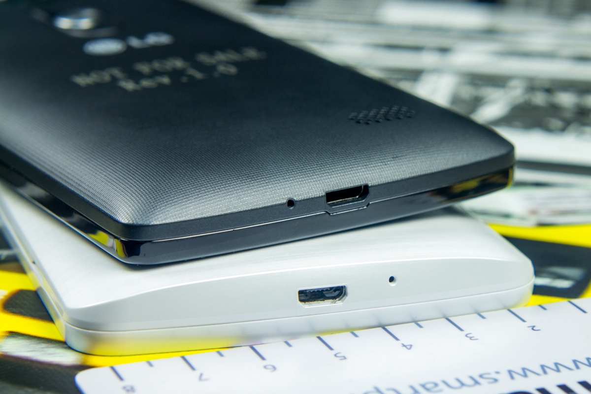 Оба смартфона выполнены из пластика, правда, материал этот совершенно разный. Тыльная панель L Bello, как и G3, абсолютно гладкая с эффектом металлизированной текстуры, за счет чего, на мой взгляд, он выглядит чуть симпатичнее младшего брата.