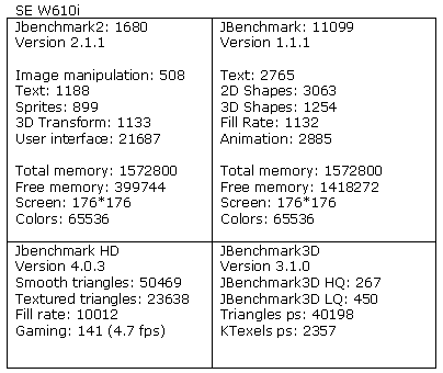 Программно телефон аналогичен модели K610i и построен на платформе JP-7, однако некоторые изменения все же имеют место. В первую очередь хочется выделить плеер Walkman 2.0, который приобрел новый интерфейс. Поддерживается сортировка музыкальной коллекции по исполнителю, альбому, жанру или плейлисту, а в каждом списке возможен поиск. Во время проигрывания трека может отображаться картинка альбома или визуализация. Имеется качественный эквалайзер, который позволит оптимально настроить звук. Звучание в наушниках из комплекта замечательное. Уровень максимальной громкости удовлетворит абсолютное большинство пользователей. В список поддерживаемых аудиоформатов вошли: AAC, AAC+, E-AAC+, MP3, MP4, M4A, 3GP, AMR, WAV, MIDI, Real Audio 8, WMA 8/9, Mobile XMF 1.0. В наличии имеется OMA DRM 2.0, которая потребуется при покупке композиций в онлайн-магазинах. Эта функция может пригодиться и при пользовании сервисом TrackID, который позволяет определить исполнителя и песню по небольшому аудиофрагменту, а также приобрести данный трек. Кроме плеера косметические изменения коснулись также редактора картинок, проигрывателя видео, Activity Menu и главного меню. Впрочем, ничего концептуально нового увидеть не удалось. В главное меню вынесены функции, на которых производитель делает акцент (среди них TrackID и PlayNow). В Activity Menu появился менеджер запущенных приложений. Там появляется радио, плеер и до восьми Java-приложений. Диктофон работает во время разговора, ограничений по времени записи нет. FM-радио поддерживает RDS. Во внутренней памяти имеется 64 Мб свободного пространства. Браузер основан на движке NetFront 3.3. Поддерживаются HTML 4.01, xHTML 1.1, CSS 1, CSS 2, Java script 1.5, dynamic HTML, что вполне подходит для нормального браузинга по интернету. Видеопроигрыватель может работать в полноэкранном режиме и воспроизводить файлы 3GPP (H263, H264), MP4, Real Video 8, WMV 8/9. Игра в W610i одна — QuadraPop. В меню «Приложения» можно найти Music Mate, самоучитель игры на музыкальных инструментах и функцию мирового времени. Производительность аппарата очень хорошая. Размер Heap динамический (512 Кб — 1,5 Мб), ограничений по размеру JAR-файла нет.
