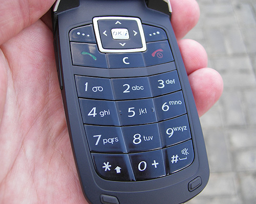 Обзор сотового телефона Samsung E380Внешность Черно-серый корпус раскладушки выполнен из гладкого, но не скользкого пластика, что позволяет без проблем пользоваться ею даже в знаменитом стиле «бегущего бизнесмена». Проверено, телефон из рук не выпадает. Вот только кнопки регулировки громкости и управления фотокамерой часто попадаются под пальцы не в самый подходящий момент. Рабочая клавиатура телефона выполнена согласно сегодняшней моде – с крайне низким профилем и широкими, плотно прилегающими друг к другу кнопками. Поначалу ощущается нехватка тактильных маркеров на «пятерке» (по неясным причинам засечки сделаны столь микроскопического размера, что их не почувствовала бы и принцесса на горошине), но крупные надписи и яркая (и в кои-то веки белая) подсветка клавиш быстро приходят на помощь. Основной экран поддерживает развертку до 12 строк в режиме работы