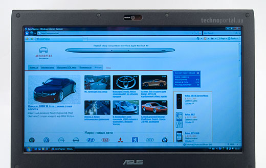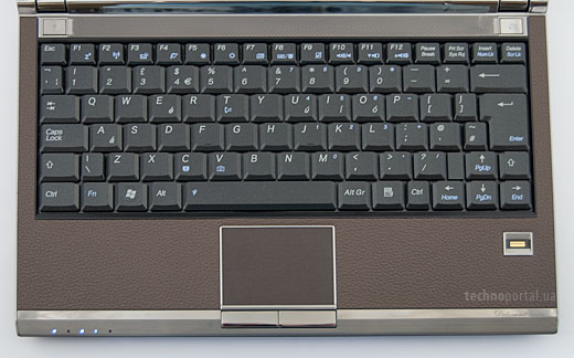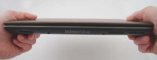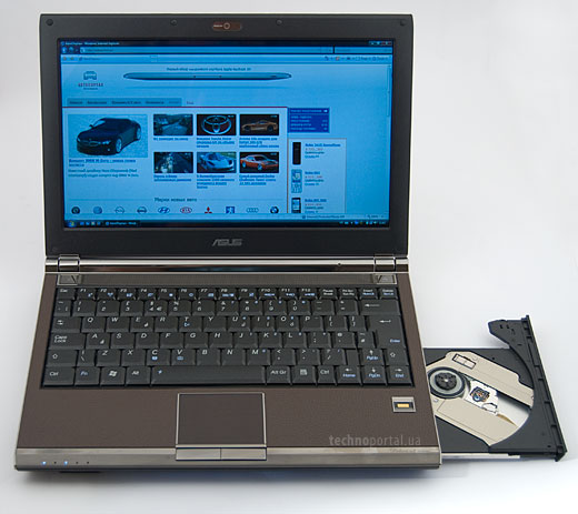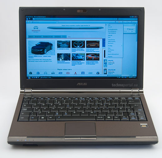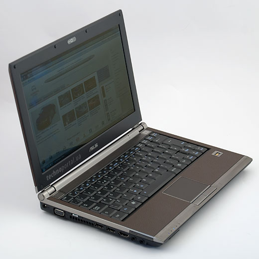 Благодаря использованию углепластика и магний-алюминиевых сплавов для создания шасси корпуса, ноутбук получился очень легким — 1,28 кг со стандартной батареей (2400 мАч). Это в полтора раза меньше, чем средний вес лэптопов с экраном 12 дюймов —1,8-2 кг. Размеры устройства также впечатляют — 277 мм на 194 мм при толщине 29 мм. Сборка качественная, все детали надежно зафиксированы, люфта нигде нет, как и подобает такой дорогой модели. Когда берешь Asus U2E в руки, его вес почти не чувствуется, и в аккуратном тканевом чехле (идущим в комплекте) его удобно носить с собой, спрятав в сумке или дипломате. Одним словом — отличный вариант для людей, у которых есть необходимость постоянно иметь под рукой компьютер. ![]() Ноутбук оснащен всеми основными разъемами, а их размещение практически идеально. В любых условиях использования ко всем портам можно будет без проблем получить доступ, а спереди и сзади никогда не будут торчать провода. С правой стороны находится оптический привод DVD±RW Super Multi, USB-разъем, входы модема и сетевой карты. С другого края размещены аудиовыход, входя для подключения наушников, micro-DVI (в комплекте есть переходник на обычный DVI), 2 порта USB, VGA-выход и вход для блока питания. Здесь же приютился слот ExpressCard, который имеет размер 34 мм, а не стандартных 54 мм как в более крупных лэптопах. На лицевой панели размещен кардридер, а сзади — крепление замка Кенсингтона. А вот для разъема FireWire подходящего места видимо не нашлось, хотя он был бы вполне уместен. ![]() Металлическая кнопка включения ноутбука находится над клавиатурой справа, а с левой стороны, симметрично ей, размещена кнопка переключения режимов работы: максимальная производительность, максимальная автономность и т. д. Биометрический сканер — под клавиатурой, с правой стороны. Индикаторы уровня заряда батареи, работы Wi-Fi, использования жесткого диска и т. д. расположены на переднем торце корпуса устройства. Стоит отметить, что при использовании батареи увеличенной емкости (4800 мАч), она будет выступать сзади ноутбука приблизительно на 10 мм (на фото - лэптоп с штатной батареей на 2400 мАч). ![]() Конструкция ноутбука Asus проработана так же качественно, как и дизайн. При очень компактных размерах устройства инженерам удалось не только оснастить лэптоп всем необходимым, но и сохранить хорошую эргономику. U2E работает бесшумно, и нагревается при этом на удивление незначительно. Выдувается теплый воздух с левой стороны корпуса, так что не будет чувствоваться рукой при работе с мышью с правой стороны. Нагрев днища даже при длительной работе небольшой, поэтому с устройством удобно работать расположив его на коленях. Когда мы имеем дело с ультрапортативным ноутбуком, то понятно, что клавиатура у него будет «урезанной» в сравнении с лэптопами класса 15-17 дюймов или обычной компьютерной клавиатурой. Вопрос в том: на какие компромиссы придется пойти производителю при проектировании устройств ввода чтобы разместить максимальное количество кнопок (все обычно не получается). В случае с Asus U2E, все оказалось на удивление хорошо — несмотря на миниатюрность устройства, клавиатура у него весьма удобная. Ведь размеры клавиш и их размещение подобраны оптимально. ![]() Все клавиши на своих местах, кроме кнопок навигации по тексту — они совмещены со «стрелочками». Enter большой и занимает два ряда клавиш, что очень удобн