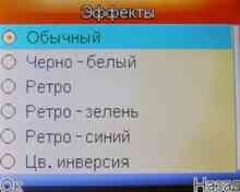 - изображение (220х176, 320х240, 640х480); - режимы съемки (авторежим, ночной режим); - эффекты (обычный, черно-белый, ретро, ретро-зелень, ретро-синий, цветовая инверсия)