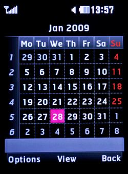 Еще один элемент режима ожидания — виджеты. Эти небольшие приложения стали переходить от моделей с сенсорными дисплеями к традиционным аппаратам. Вызвать панель виджетов можно нажатием клавиши «С». Они занимают центральную часть дисплея. В КС780 предустановлено три виджета — «Часы», «Календарь» и «Фоторамка». Для каждого из них доступно по три варианта оформления; маловероятно, что пользователям будет разрешено самостоятельно расширять коллекцию виджетов. Если виджет «Часы» обладает достаточно условной полезностью (фактически он дублирует информацию, которая традиционно размещена на рабочем столе и без его активации), то календарь и презентация отснятых фотографий имеют право на повседневное использование, поскольку облегчают доступ к соответствующим пунктам меню, т. е. владельцу не придется даже заходить туда.
