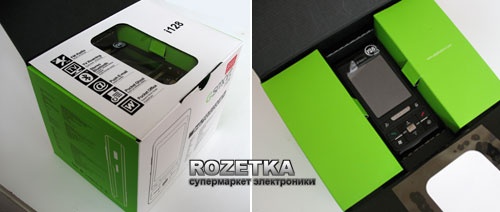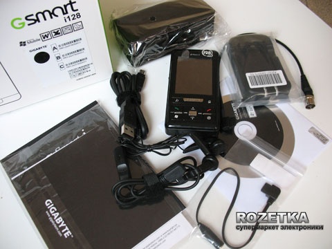 Gigabyte GSmart i128 коммуникатор со встроенным ТВ-тюнером, причем наличие тв тюнера никак не ограничивает коммуникационных и вычислительных возможностей устройства. Это не первый коммуникатор оснащенный встроенным приемником аналогового ТВ, первый принадлежал той же Gigabyte Technology и имел всего 64MB(RОM) и возможно поэтому не получил широкого распространения. GSmart i128 построен на базе процессора Intel PXA272 412Mhz, и как видно из названия имеет 128MB (ROM) и 64MB(RAM) памяти расширяемой с помощью карт памяти Mini SD, он оснащен трех диапазонным GSM/GPRS модулем, беспроводным адаптером Wi-Fi (802.11g) и интерфейсом Bluetooth. Мультимедийные возможности коммуникатора не ограничиваются одним лишь встроенным приемником ТВ сигнала, GSmart i128 имеет встроенную 2х мега пиксельную камеру с функцией макросъемки цифровым зумом и возможностью записи видео и встроенный FM приемник с возможностью записи радиотрансляции в память устройства или на карту памяти. Итак, познакомимся поближе с этим устройством. Упаковка: что внутриВ начале скажем несколько слов о самой упаковке, коммуникатор поставляется в несколько необычной для подобных устройств коробке внешне, больше напоминающей упаковку Box-овых процессоров AMD для настольных компьютеров, по крайней мере цветовая гамма из белого зеленого и черного цветов вызывает подобные ассоциации. Открывая коробку не появляется чувства что на ней сэкономили, не возникает подобного чувства и от количества принадлежностей входящих в комплект поставки, в комплекте вместе с устройством поставляется все необходимое для того, чтобы нормально пользоваться коммуникатором. Коммуникатор находится на специальной картонной подложке снимая которую открывается доступ к остальным принадлежностям. В комплект поставки входит: сам коммуникатор, батарея, зарядное устройство для батареи, кабель синхронизации, наушники, переходник для обычных наушников, переходник для внешней антенны, чехол, ремешок, запасной стилус, диск с ПО и инструкция пользователя. В общем есть практически все что может понадобится в процессе эксплуатации, нахватает пожалуй автомобильного держателя и зарядного устройства от прикуривателя, хотя если быть откровенным, то